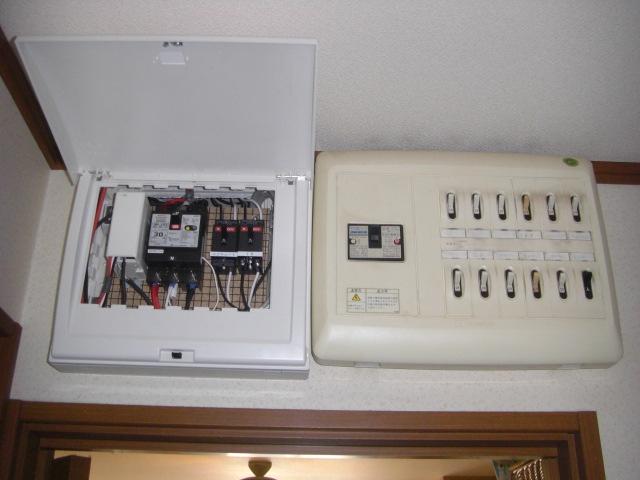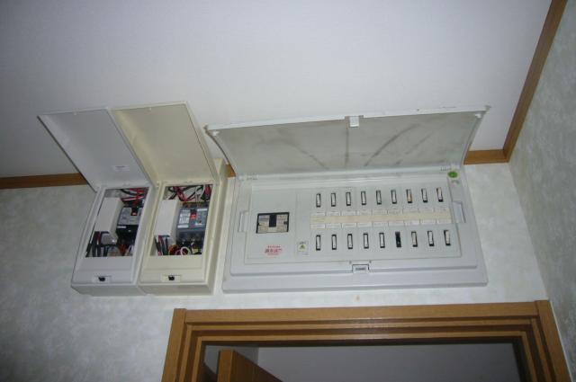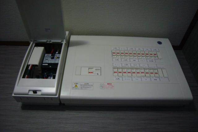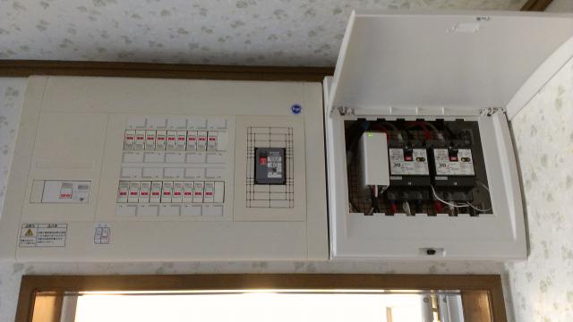 太陽光ブレーカの取付です。Eテックスでは標準の同一メーカで統一で仕上げました。