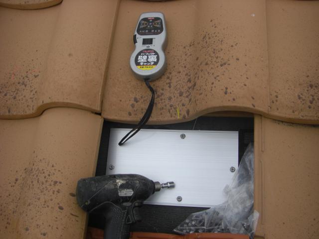 金具を垂木に確実に固定するために、屋根から垂木センサーを使い 屋根裏からビスが垂木に当たってる事を確認しています!!(*^。^*)