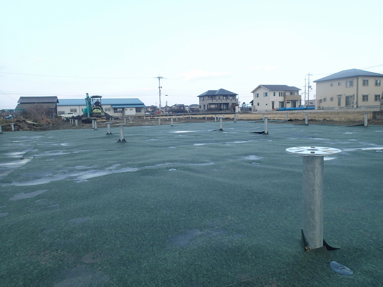 造成、スクリュー工事と進んで、次は雑草対策のため防草マットの工事です。