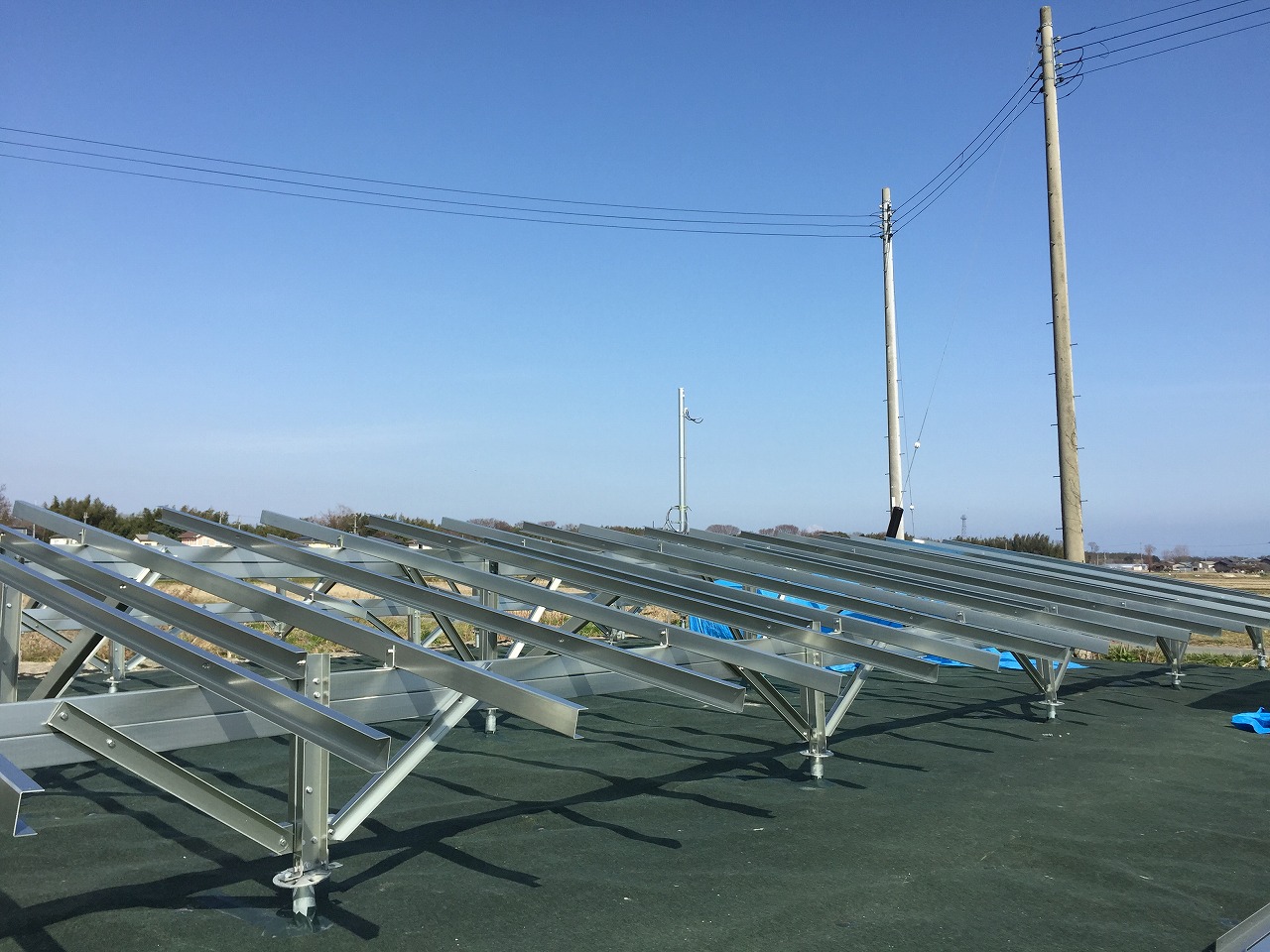 杭打ち、防草マット工事、の続きで本日より太陽光パネル・架台の搬入・組立工事を行っております。