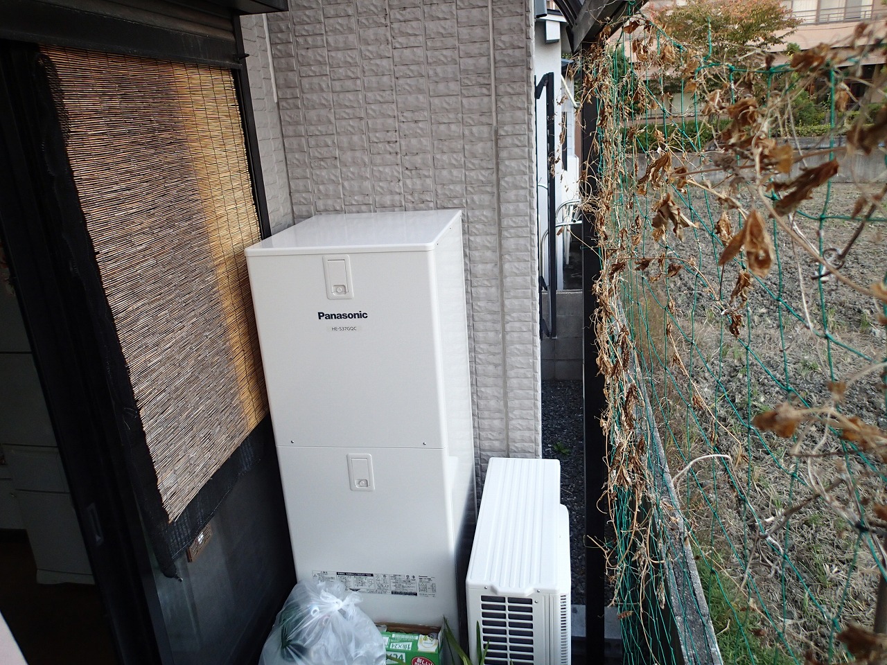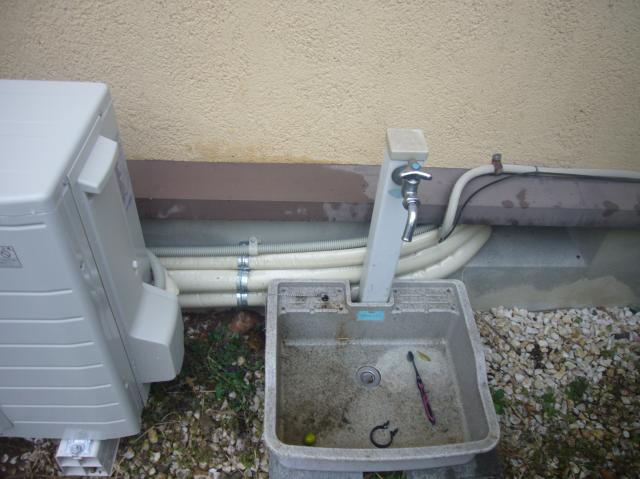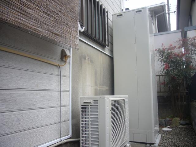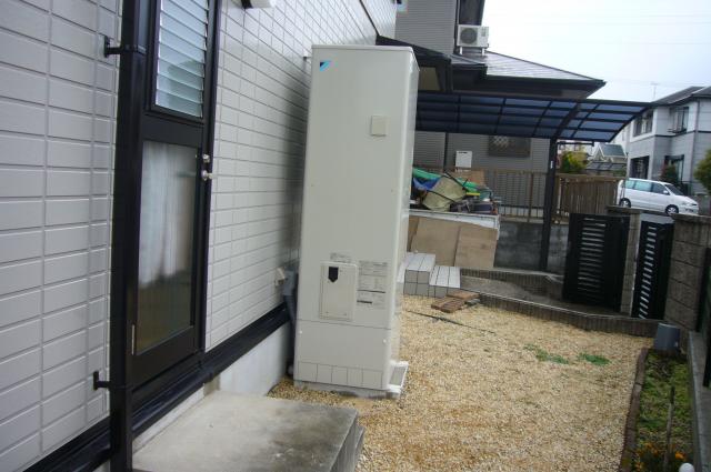 タンクとヒートポンプは少し離れますが、既設のヒートポンプとの兼ね合いとヒートポンプは風通しのよい場所の設置をオススメしていますので、こちらの位置に設置させていただきました。