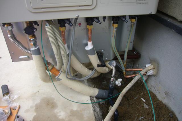 給湯器の基礎をはつり配管を脚部カバーに収まるように配管を立ち上げます。
