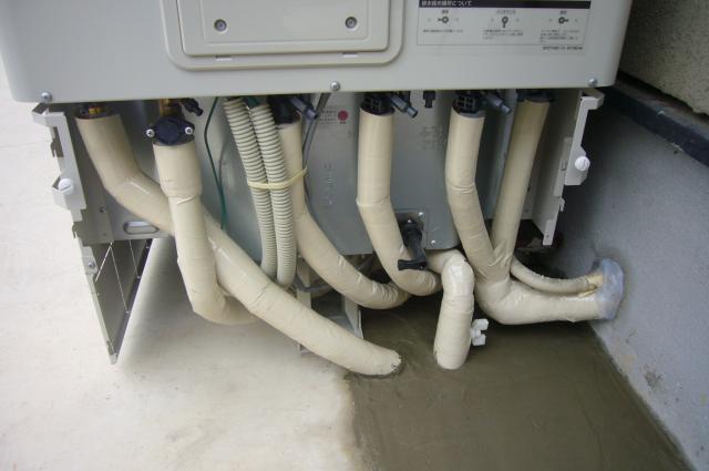 水漏れ点検後、保温材とテープ巻きをしてモルタルを流し込みます。