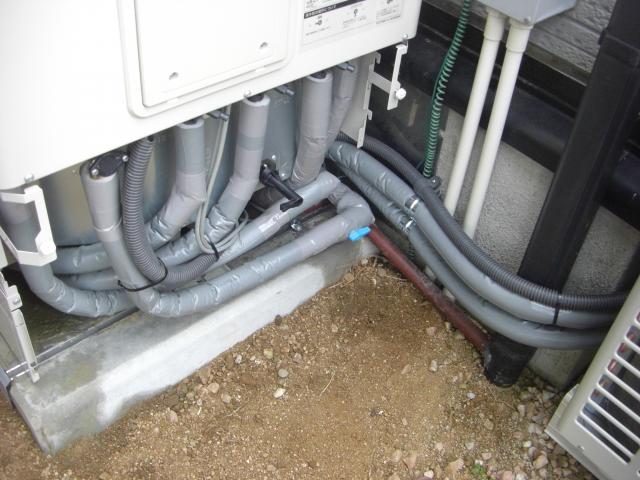 足カバーをつけると配管は全て隠れて、凍結予防にもなりいい仕上がりです(^-^)