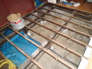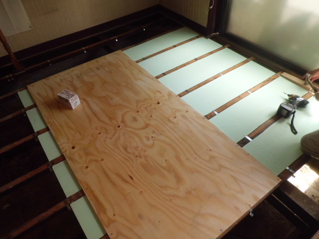 床板を解体し、大引きや根太が痛んでいないか確認。断熱材を入れて下地工事を行ないます。