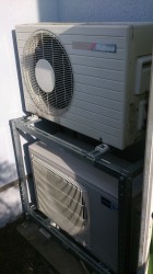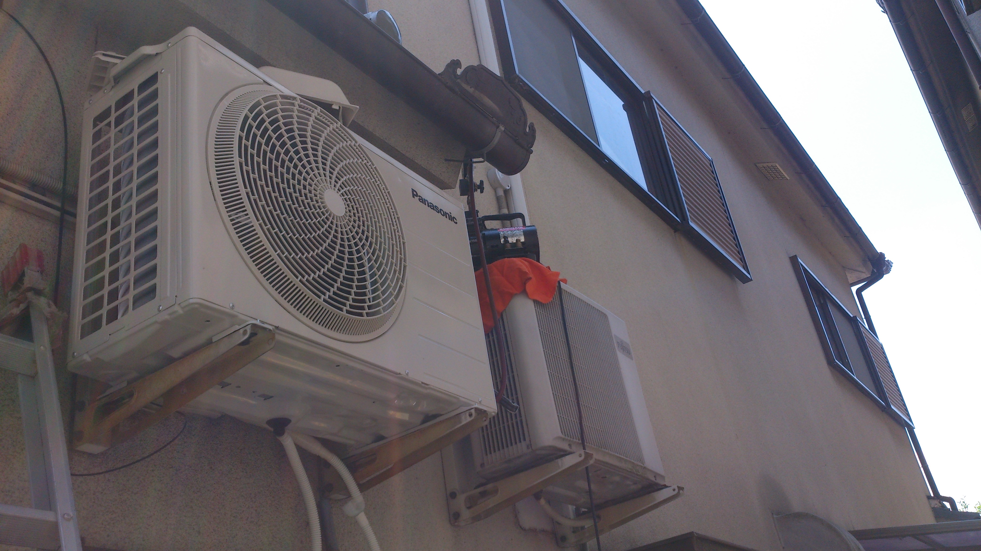 途中で室外機の場所を壁掛け金具をつけて地面から壁掛け金具の上に室外機を移設したエアコンの