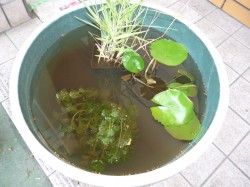 水連鉢に水連とメダカが好きな水草をいれて水道水をいれ