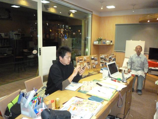 屋内で現場監督さんと打ち合わせ中の店長。