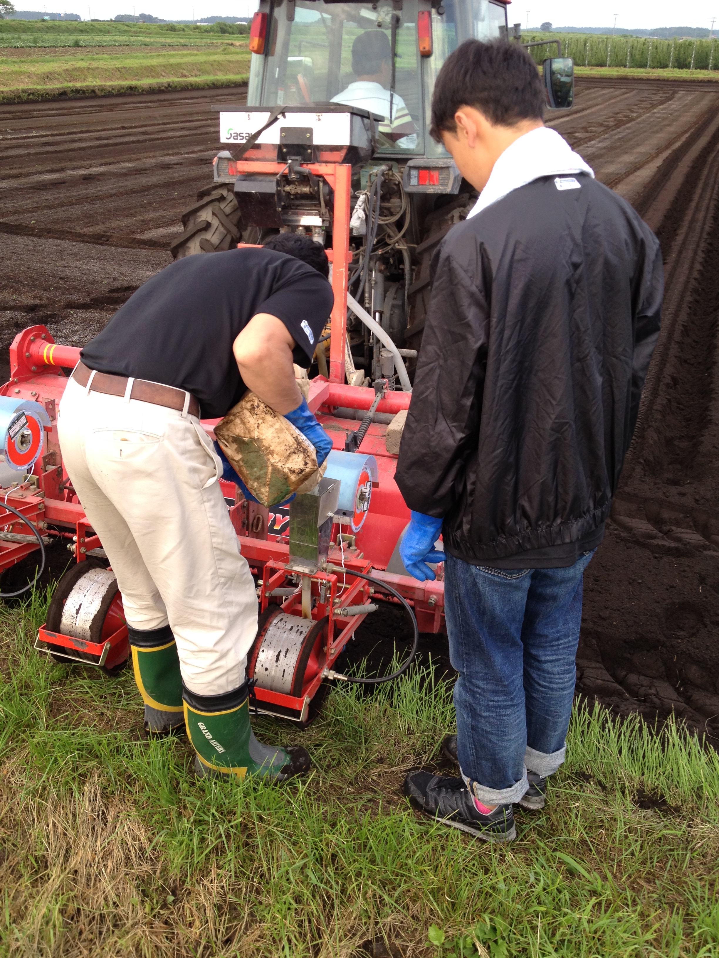 学校で白線を引く道具に似た道具を押して、種蒔きしてました。