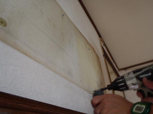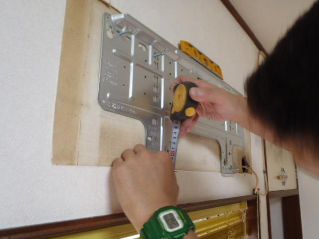 室内機の取付板を仮止めし、ボードアンカーの穴を開けてる所の写真です。