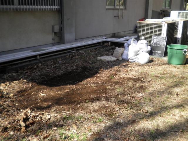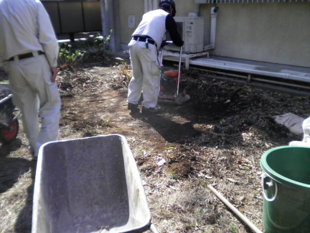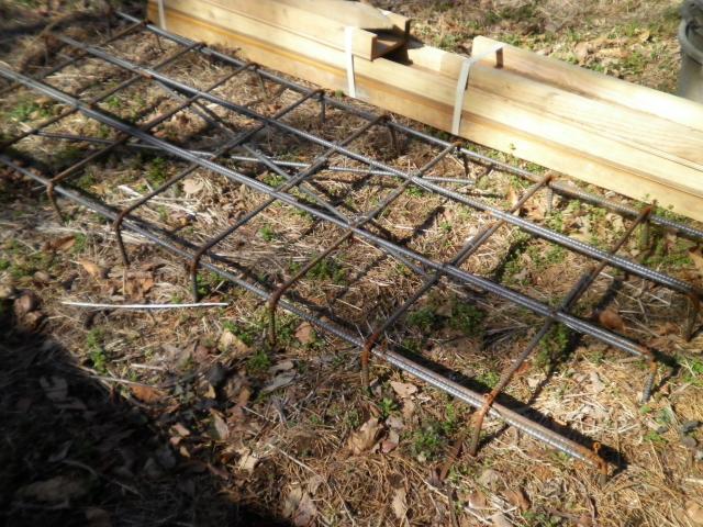 落葉を撤去して点圧を掛け、組んだ枠に鉄筋を入れて、