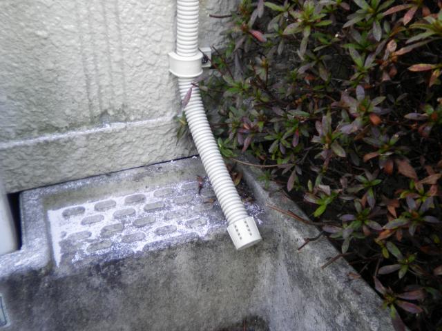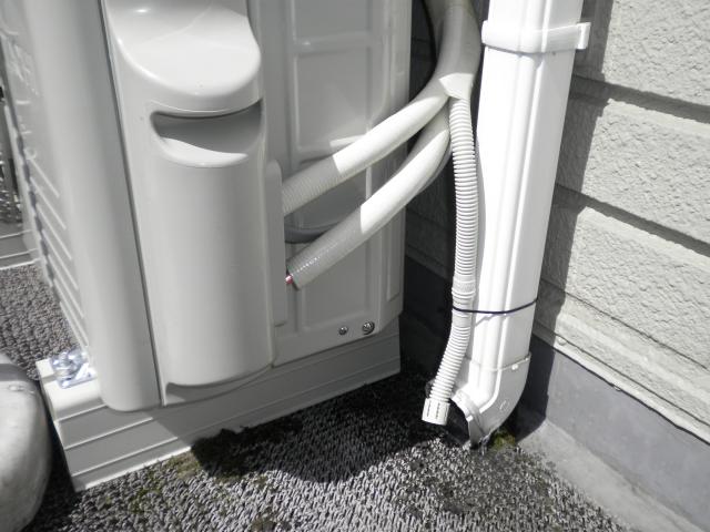 見にくいですが、ドレンホース(水の出るホース)には、虫さんカバーを取り付けています。