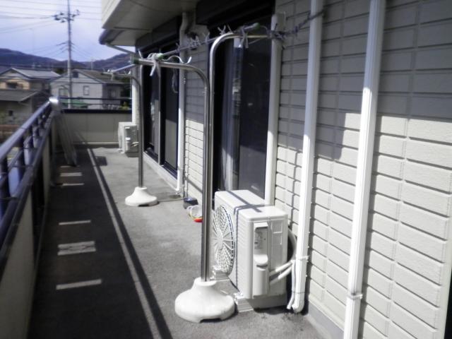 2階洋室は直下に室外機、1階茶室は植込みが在りますので、離れた場所に設置。