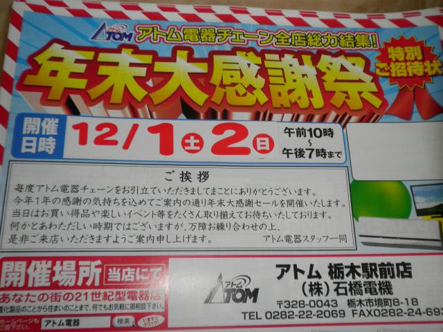 栃木駅前店は1週間ずらしまして、12月1日と2日の土日に開催します。