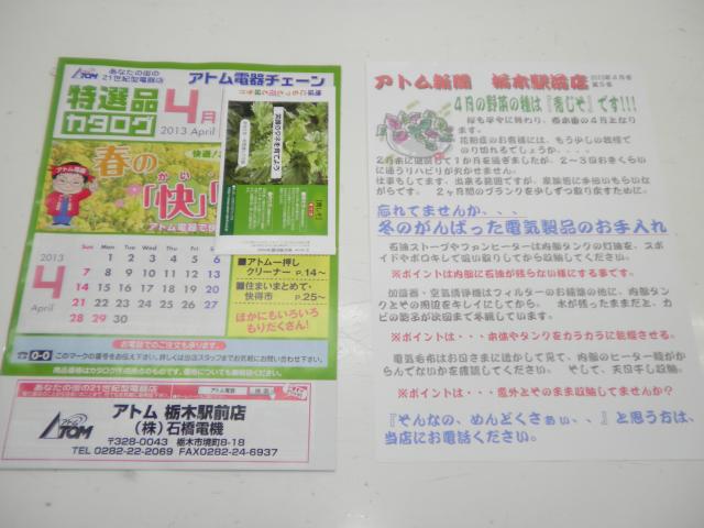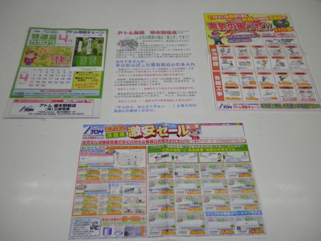 スタッフブログ 2013年3月30日アトム電器特産品カタログ4月号・特価チラシ(エアコン・冷蔵庫)・