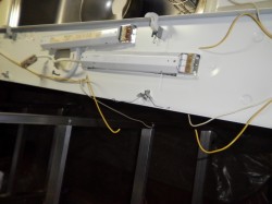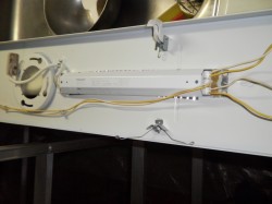 スタッフブログ 2013年6月13日キッチンの天井にある照明器具が不良です。 10分ぐらいすると消えてしまい、また直ぐ点灯するそうです。 電子安定器が不具合の原因です。 一度お伺いして、メーカーと型式を確認。 部品の供給が可能との事で、入荷次第に交換してきました。 それでも4日間は掛りましたので、ご不便をお掛けしてしまいました。 器具を取外し、安定器の配線を確認後に全部切断します。 8本あるタイプですので誤配線しないように注意します。 そして器具を取り付けて、カバーと蛍光管を掃除して完了となります。