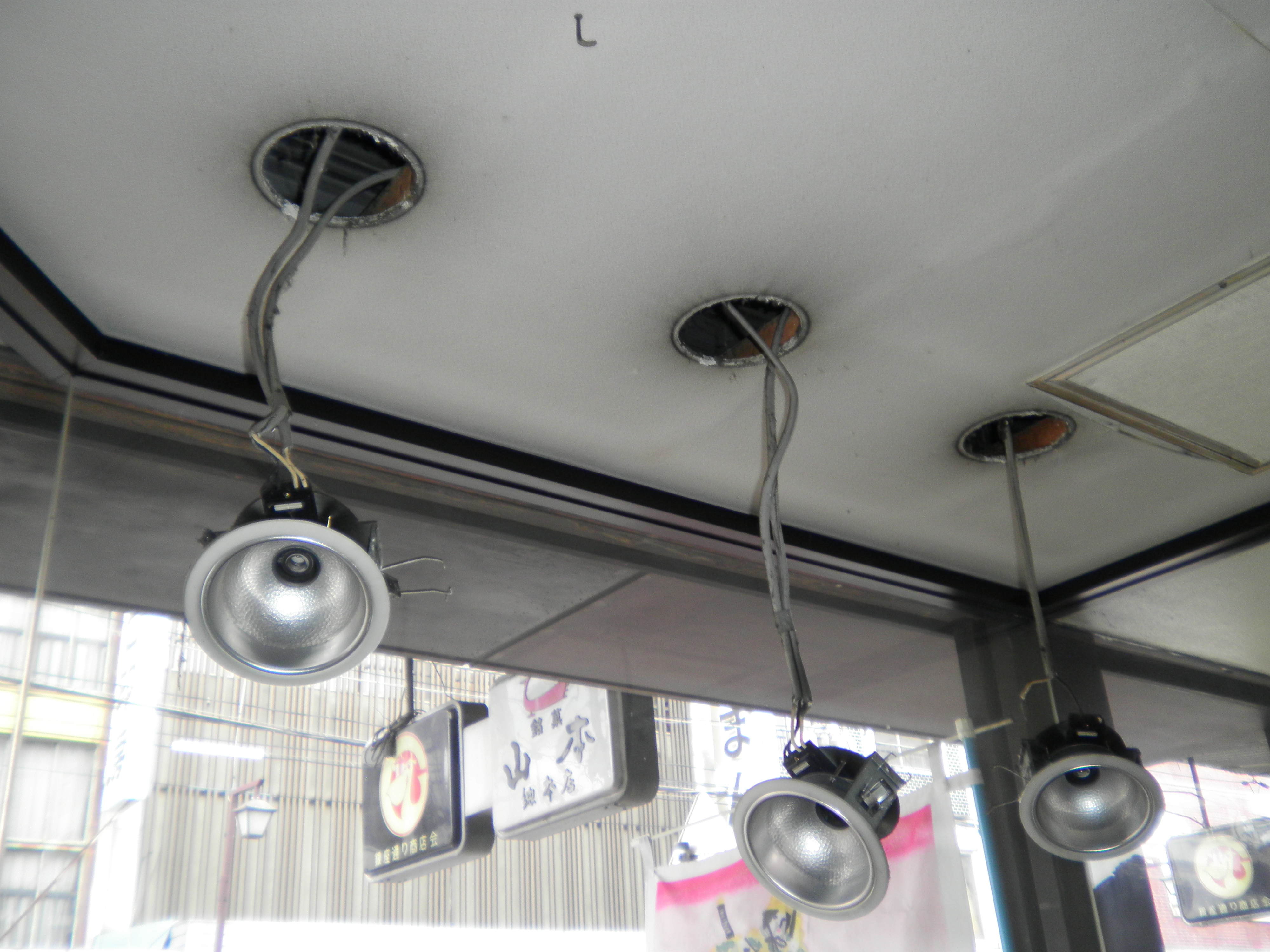 古い器具を撤去して開口部付近をお掃除。 専用器具に配線をつないで埋め込みます。 ばね式ですので、パチンと開口部に密着してくれます。 交換後に点灯試験をします。 昼間でも、暖簾にLEDランプの明かりがとどいているのが、写真でも確認出来ます。 直進性の光のの特性です。 これで、和菓子の美味しさも、目からも伝わるかと思います。 創業明治二十五年 『山本總本店』 地元栃木の有名和菓子店さんです。 ご依頼ありがとうございます。