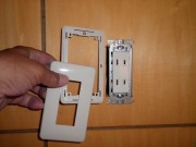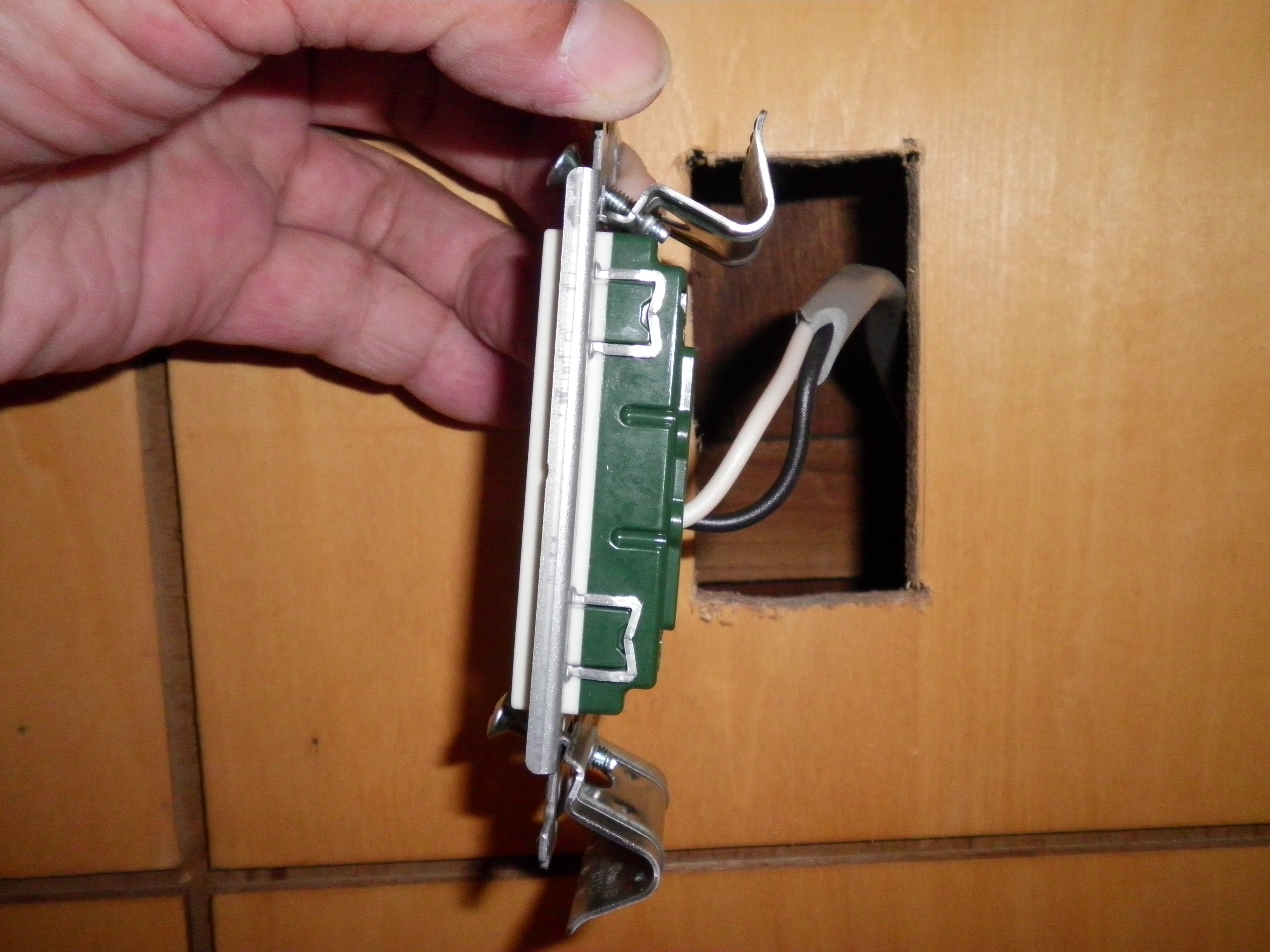 新設コンセントは壁はさみ金具を使って固定して、コンセント枠とプレートを付けて完了です。