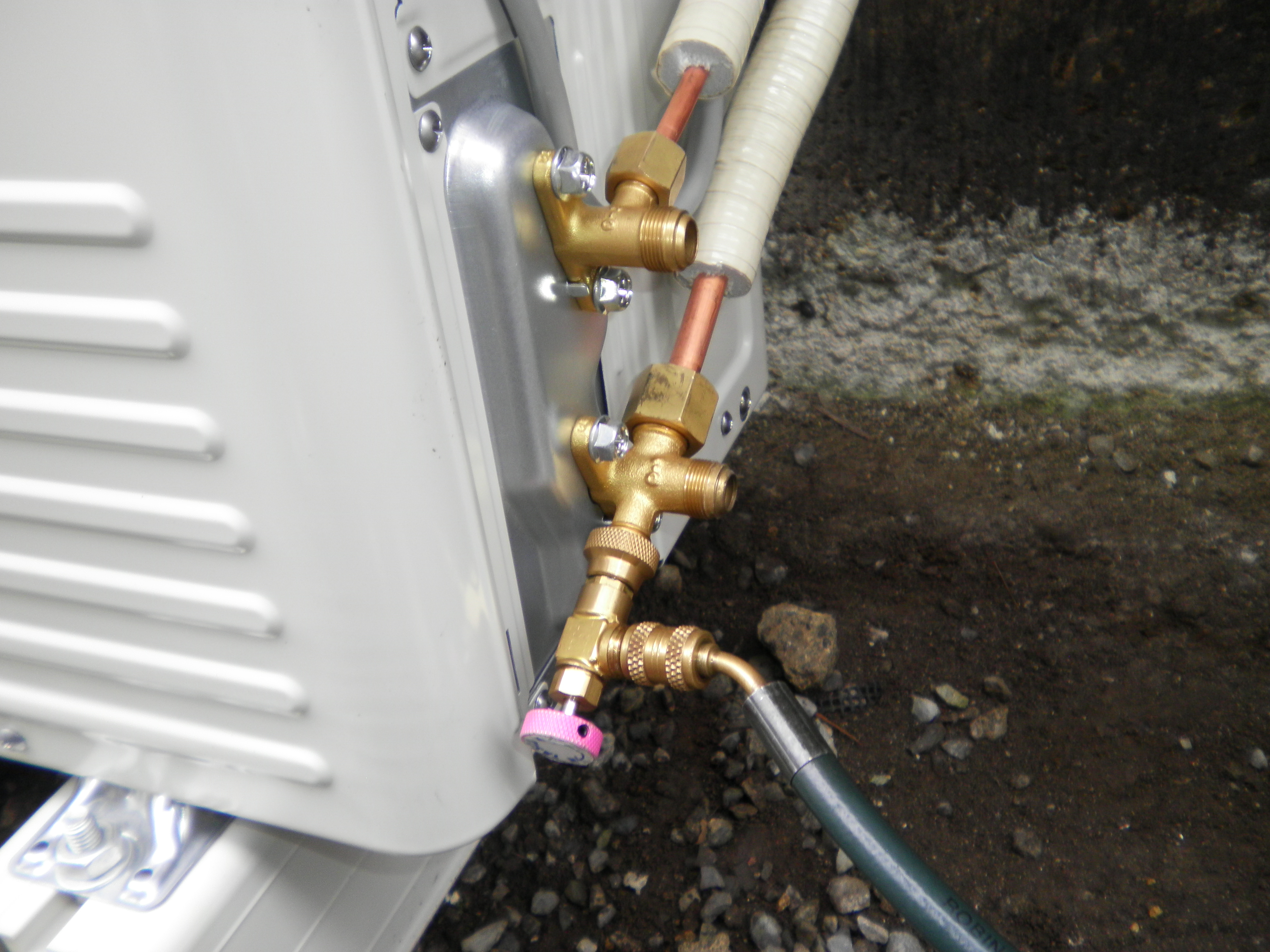 木部のタテサンは既存を使用します。 外壁は塗り壁でして、これも注意をして工事をしていきます。 配管を加工して真空ポンプをセットし、真空引きのさ作業をしていきます。 バルブを使い一滴のガス(冷媒)も逃さない様にします。 これを使うと、無駄にガスを大気に逃がしませんし、作業が楽になります。