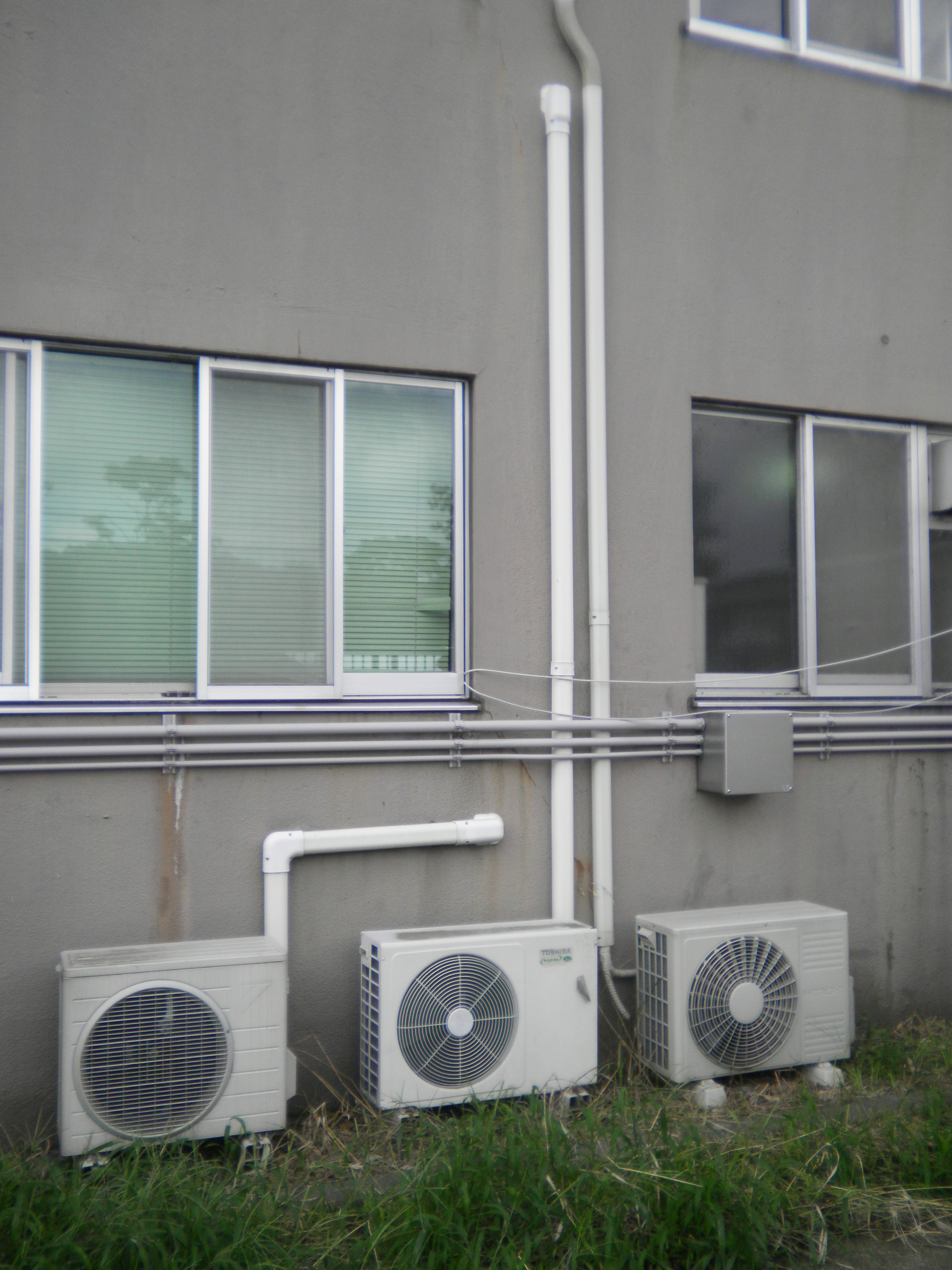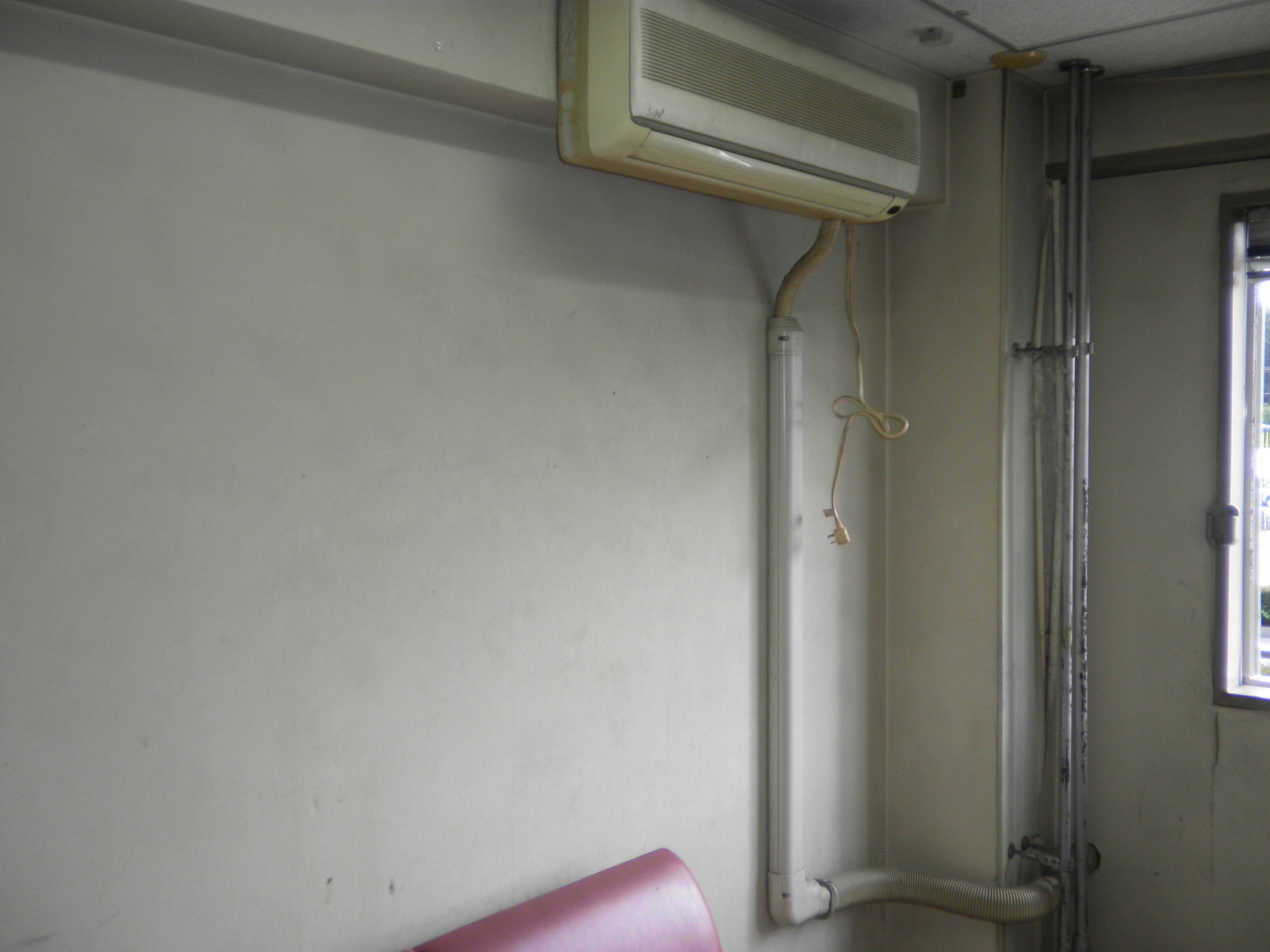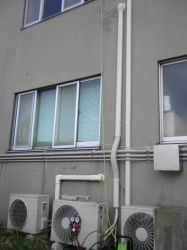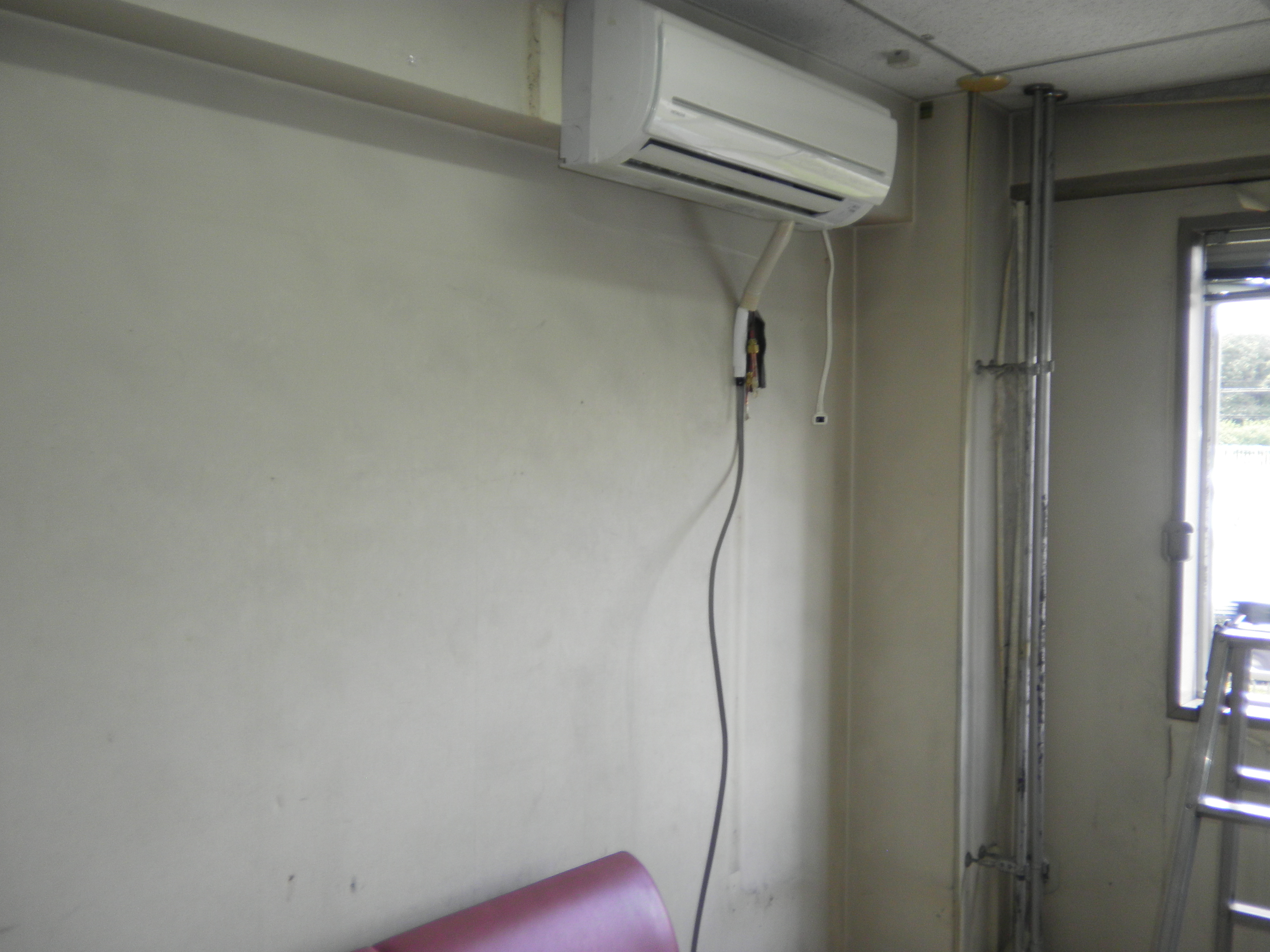 このエアコンを撤去して、事前に撤去していた別のエアコンを据付ます。 室外機は中央の物です。室内・室外のスリムダクトカバーも、新しい物に交換します。