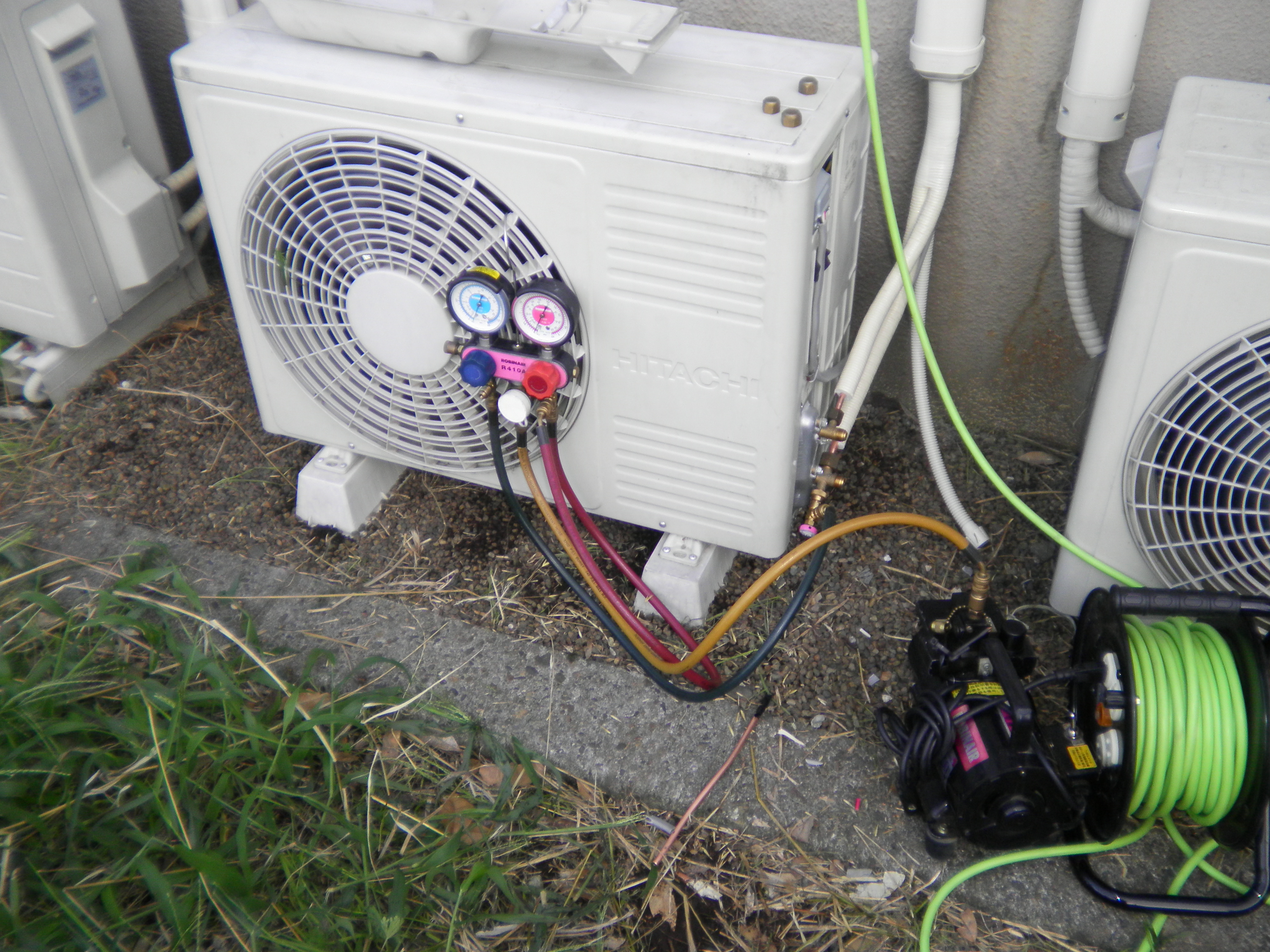 後はいつもの順番でバルブを使い真空引きをして、虫さんカバーをドレンホースの先端に付けて完了します。 外部もスリムダクトカバーを取り付けてのご希望ですので、キッチリ工事して、、『自己満足』しました。