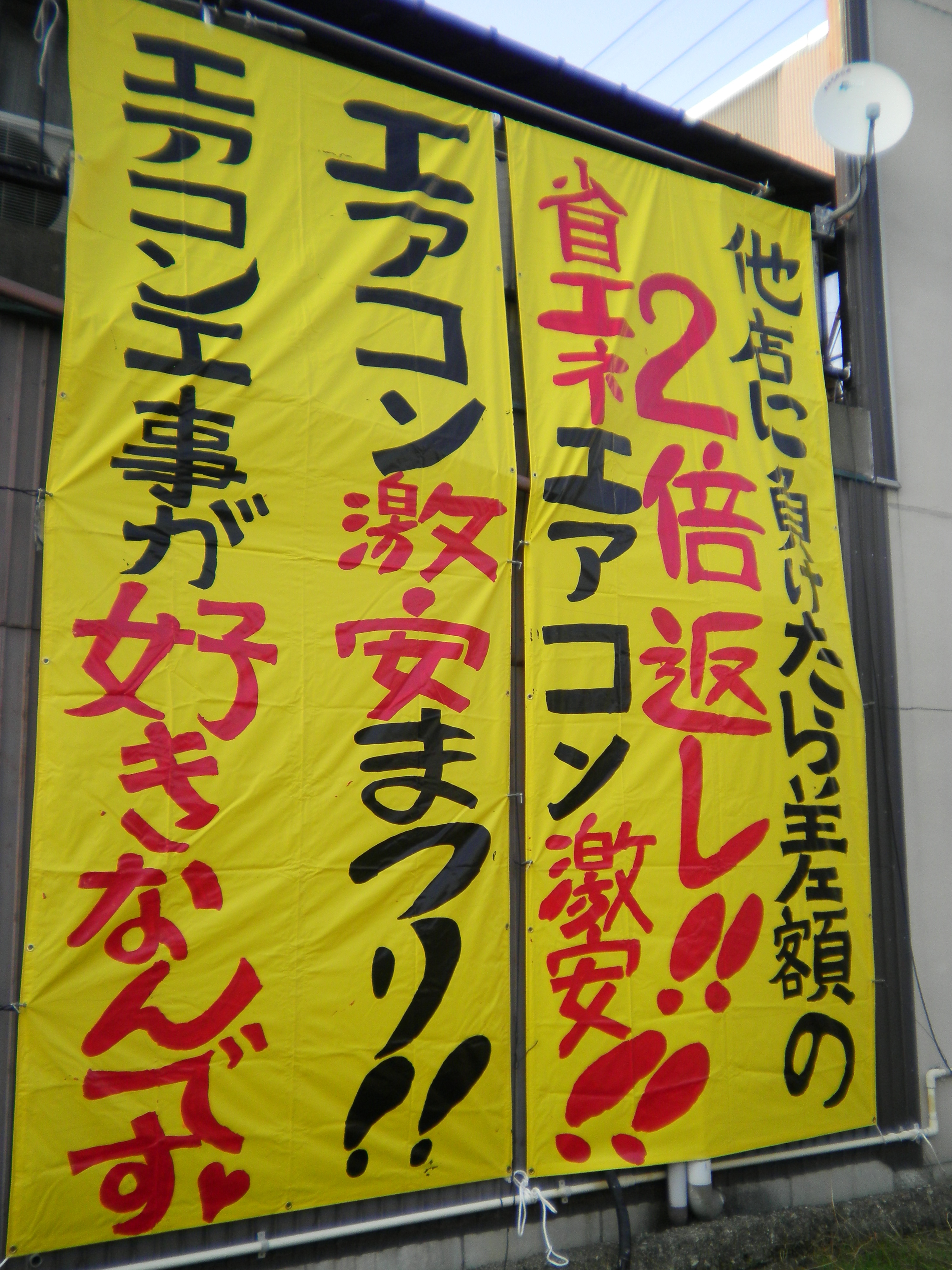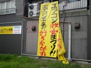 この夏、このターポリンを見て・診て・観て・視て・満て・・・来店いただいたお客様がイッパイいました!!!!!!! 看板見て・車で通ると気にかかり・・・・ ご来店ありがとうございます!! それと、車で通りすがりに店内を見て、私と目が合う事もしばしば、、、、。 余程怪しい『街電』と思はれたかァぁ、、、、 兎も角、、、目立ってこその看板です。 キレイな、ステキな、、、看板は当店は、、、いらないかなァ、、。 少々しばらく看板無しですが、何か、考えます、、、。 「あっと、おどろく、為五郎」的な、ターポリン看板、登場したい。