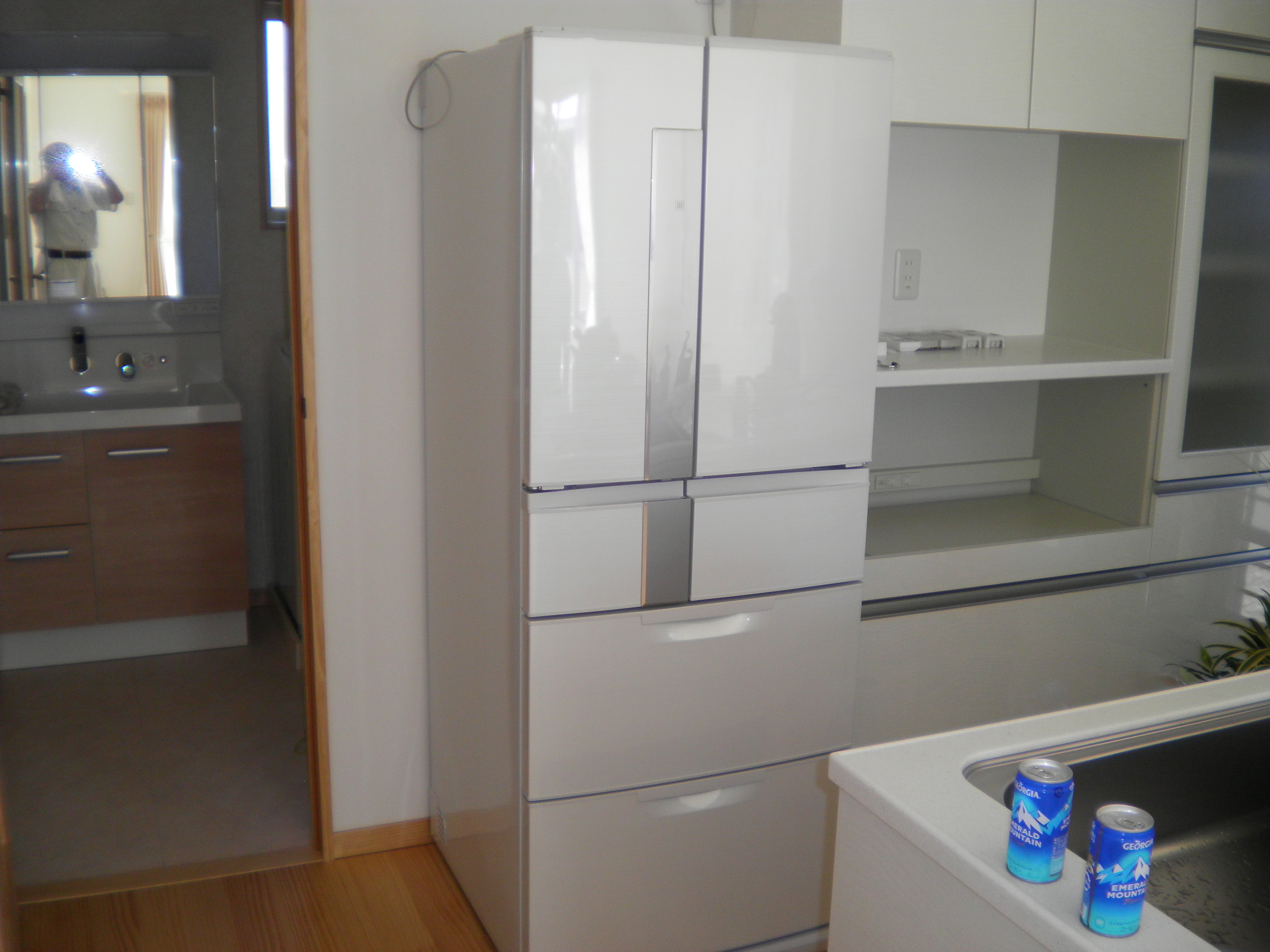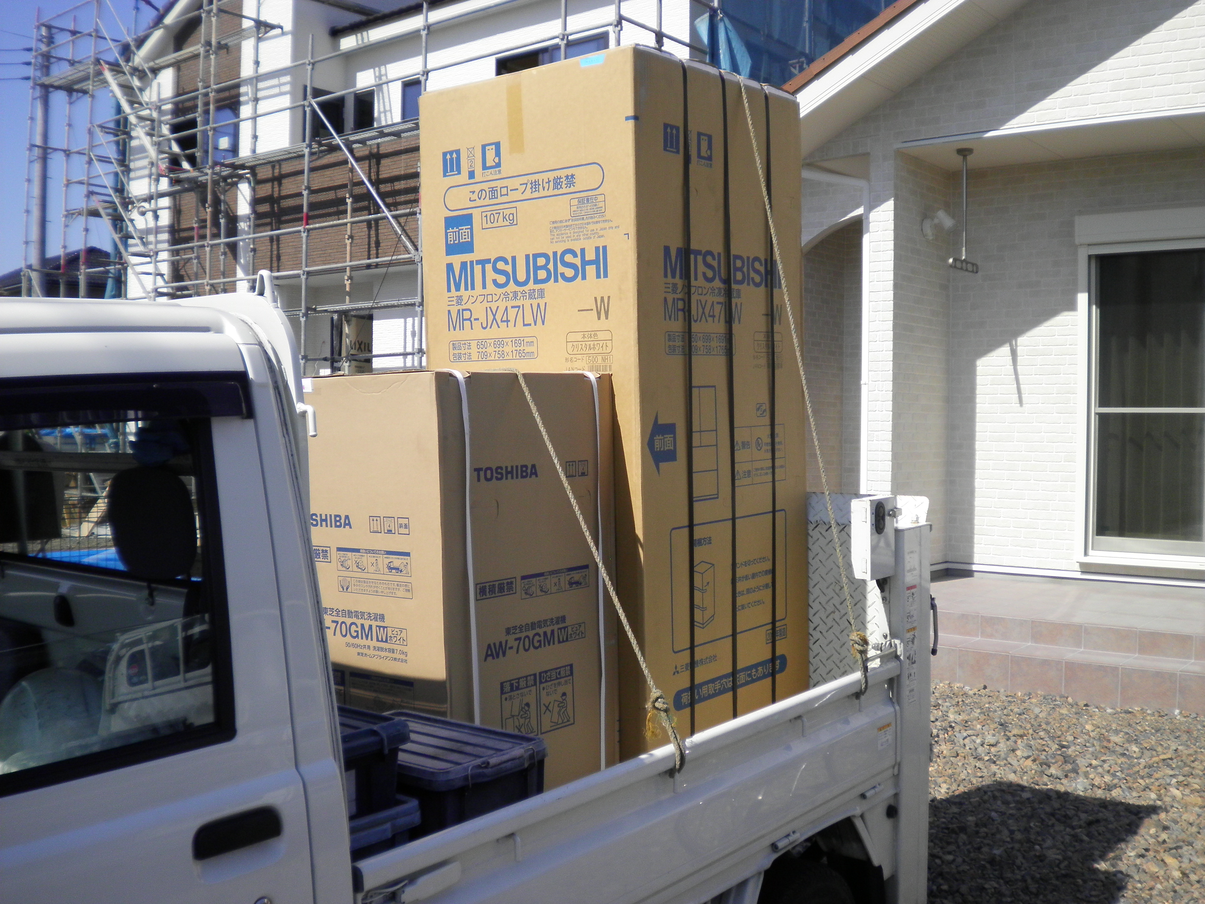 遠方から生まれ故郷の栃木市へ、ご新築お引っ越しです。 引越し荷物より先に、冷蔵庫と洗濯機を納品させて頂きました。 お一人住まいですが、洗濯機は7キロで冷蔵庫は470リッターを選んでもらいました。 三菱の冷蔵庫ですが外寸法が小さいのに内容量はビックです。 とても470リッターには見えません。
