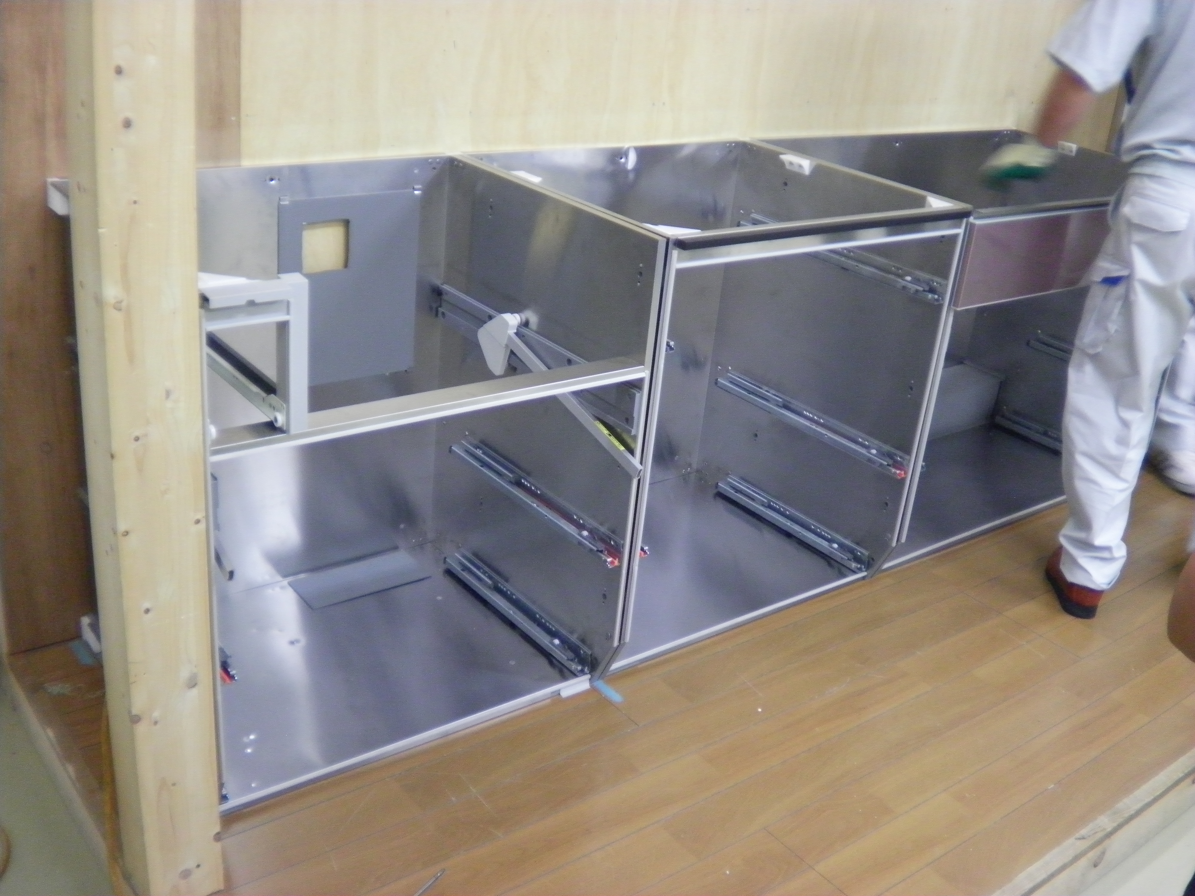 組立初めのステンレスキッチンは、こんな感じです、、、。 「キャシャ」に見えますが、連結し・天板を載せると頑丈な製品です。