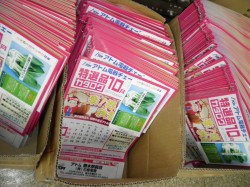 アトム電器 特選品カタログ10月号の準備です。 カタログに「野菜の種」をホッチキスで止めます。 毎月カタログに「野菜の種」を添付して、お客様宅にお配りしています。