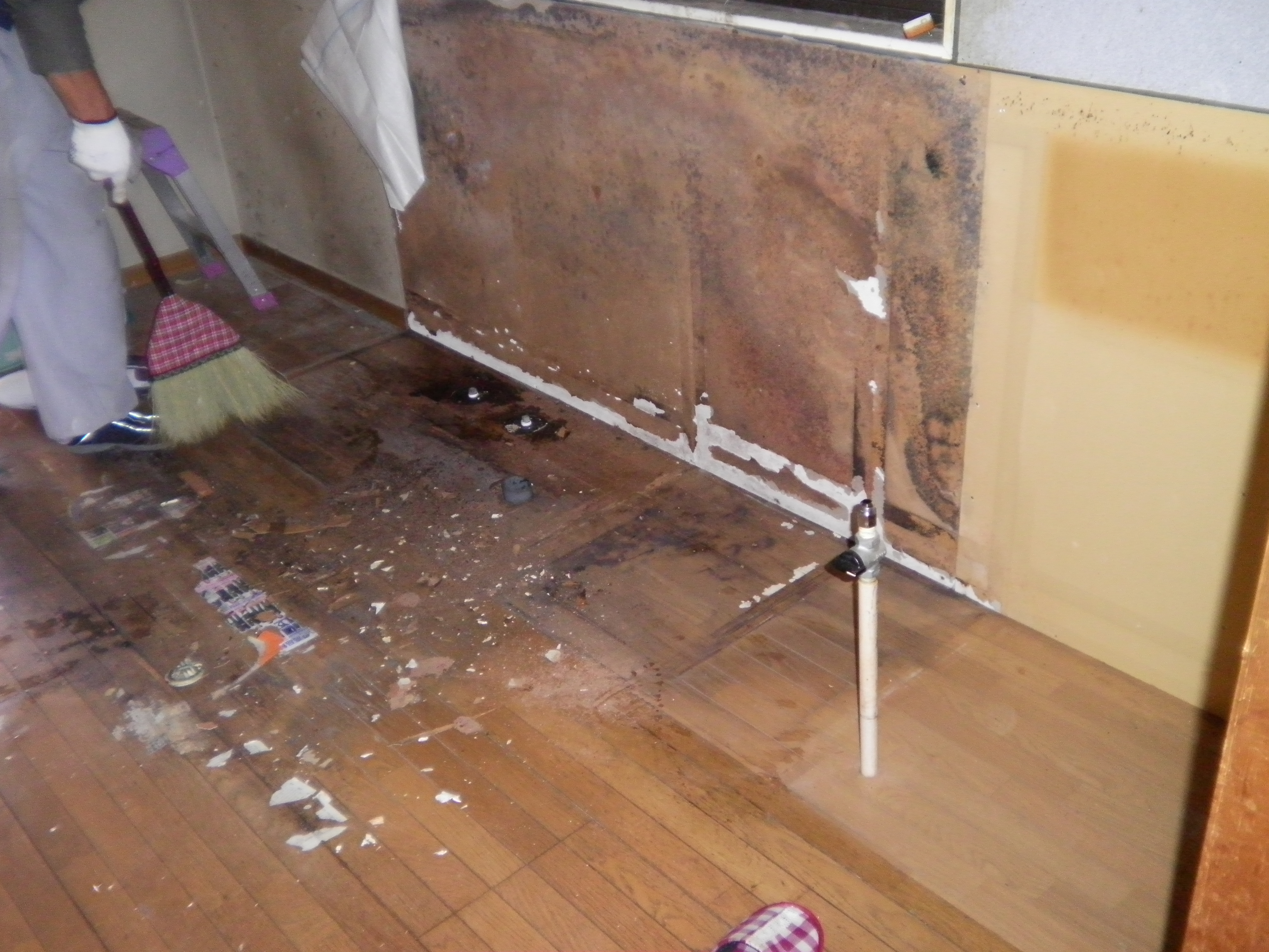 流し台の下にある物を全部出したみましょう!!! そしてよく見てみましょう。 手で指で押して見ましょう。 フカフカしてない? 斜めになっていない?