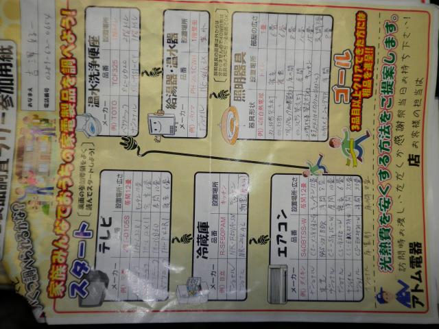 スタッフブログ 2012年5月26日アトム電器の『夏の大感謝祭』1日目でした。 朝一の電話で「来店するのでよろしく、、」との事、遠方からのお客様で、車でスイスイでも40分掛けてのご夫婦でのご来店でした。 ランドリーにIH釜をお買い上げいただき。 それに何と何と、「家電品調査ラリー」に、全てのメーカー・品番・設置場所を記入してご持参頂きました。(スゴイ、時間かかったでしょゥ、、) それを基に、節電のお話で盛り上がりました。 リビングの42インチのプラズマTVの消費電力が、ロックオンされました。