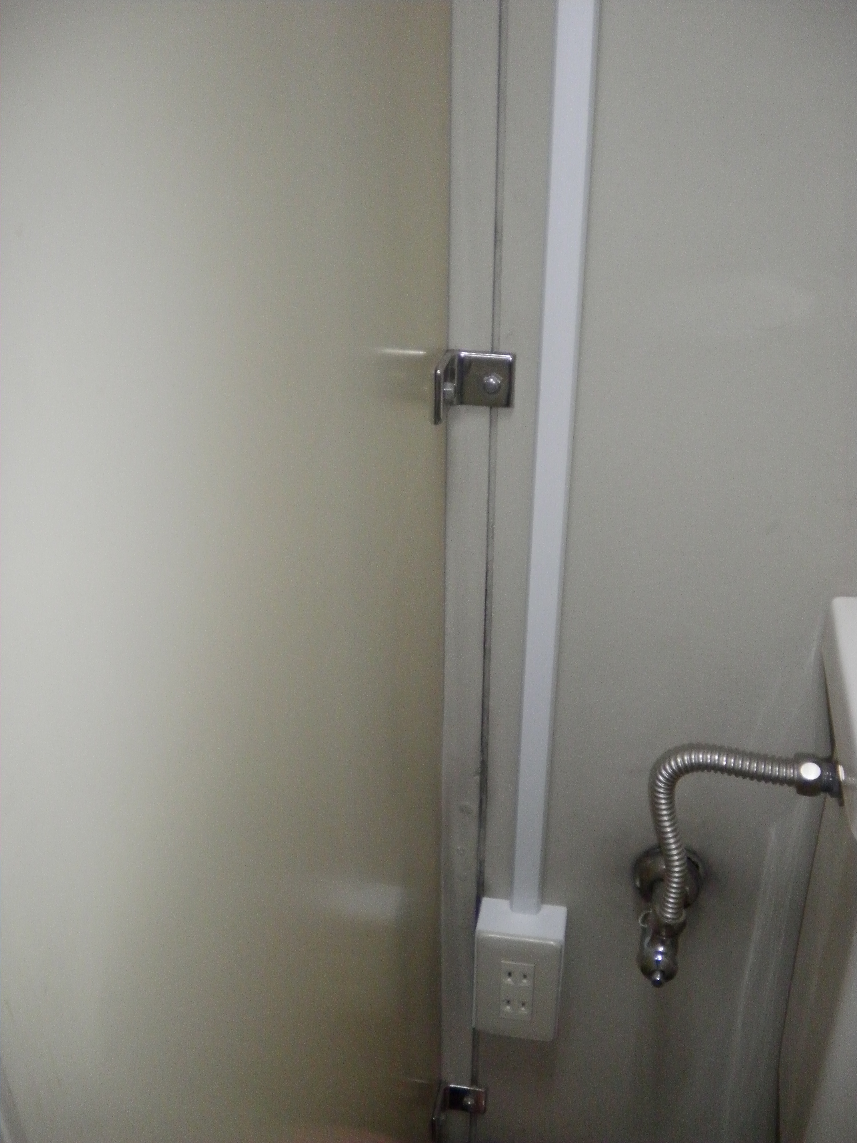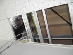 事務所のトイレで壁内に配線不可でしたので、モールとボックスを使って露出配線にしました。 この中に、設備屋さん・大工さん・私の電器屋さんが、譲り合いしながらの工事でした。