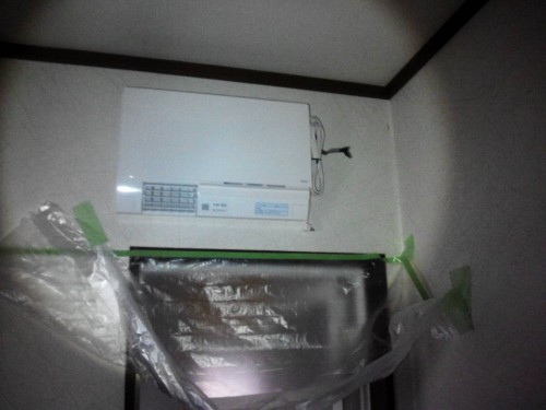 電気工事の為にブレーカーを落としていますので、手持ちのLEDライトで写真を撮りました。汚れ防止の為に薄いシートを機器の下に浮かして引き、床にも同様にシートを敷いて「養生」をして工事をします。手数が掛るように思われますが、かえってこの方が片付けが楽にもなります。 もちろんお客様も安心していると思います。 脱衣場は裸足だったり、タオルやシャンプーなどなど、いろいろおいて在りますし、、、。