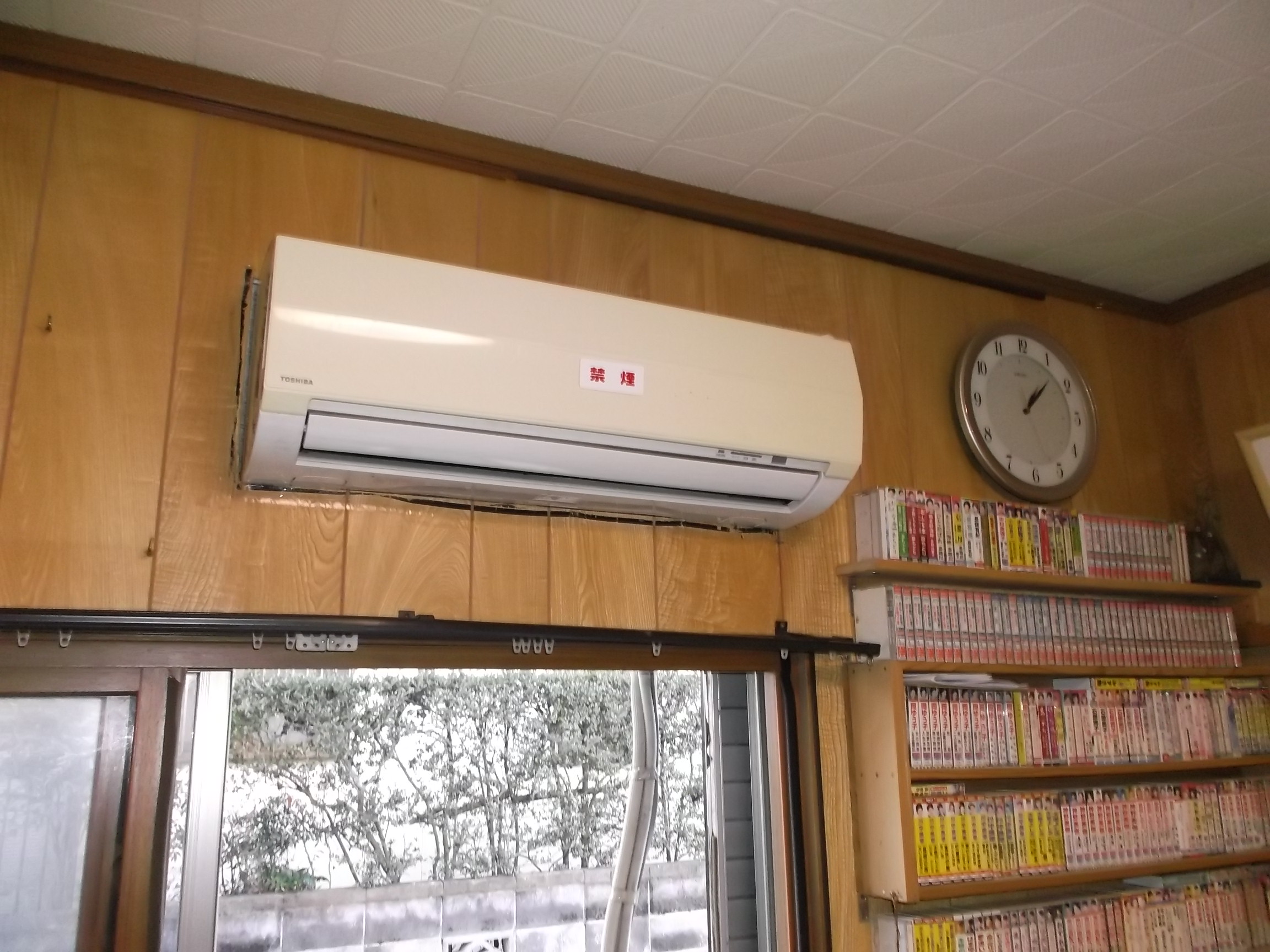 このエアコンを交換します。 何処かのリフォーム屋さんが、エアコンを付けたまま室内の壁板を張り付けてしまいまして、、。 このエアコンは壁板に埋もれています、、、。 タテサンを使って以前取り付けたハズですが、、、、。