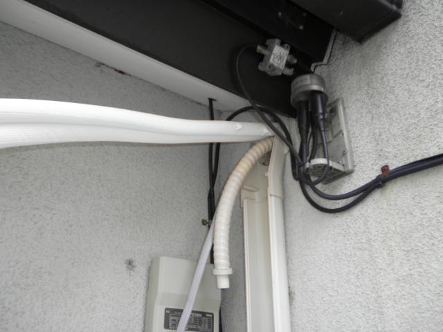 『断熱ドレンホース』を使用します。でないと、結露し水滴がタレテきます。