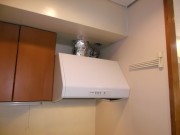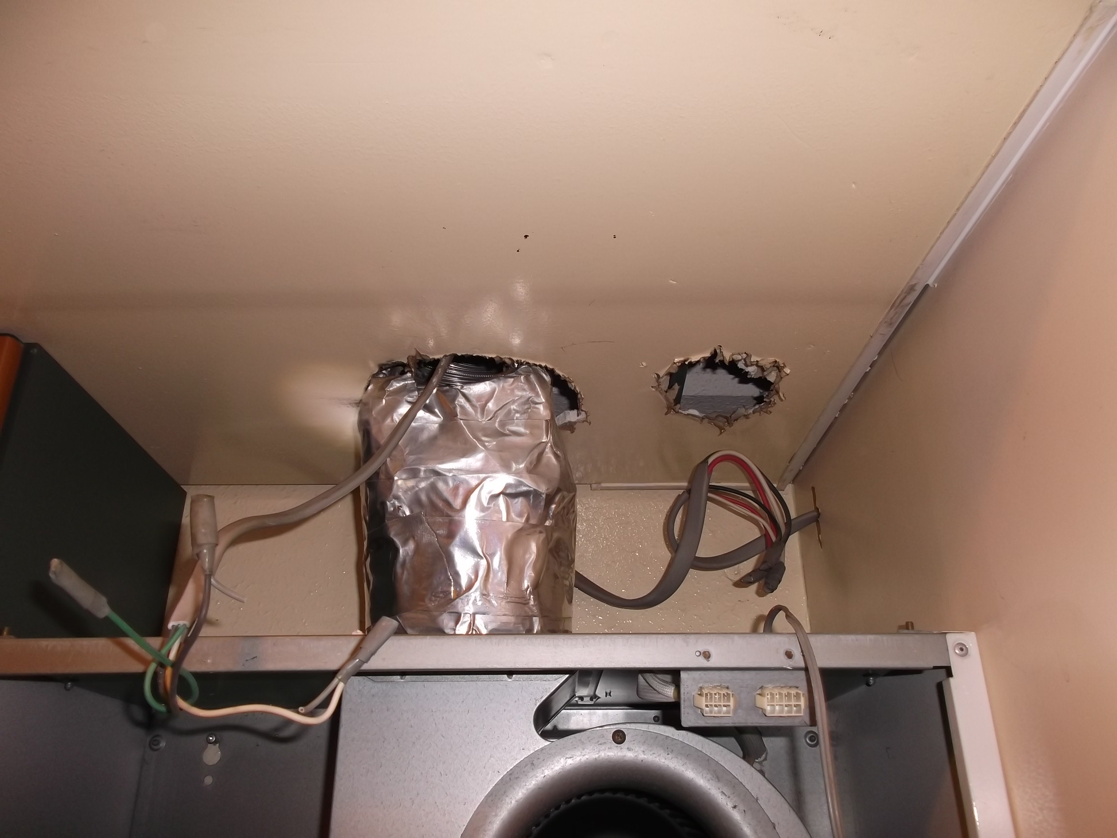 排気も天井裏に手を伸ばし、「バッチリ」引っ張りました。 アルミのテープを使い、「バッチリ」抜けない様に接続します。 ここの場合の問題点は一つだけです。 レンジフードの排気口の位置と、天井の排気口の位置が、、、合っていません。 機器が寸法通りに取付けされているのだから、排気の開口寸法(穴を開ける位置)も合わせていれば、、、。 15年後の業者さん(私)が、苦労しないで取付け出来たのに!!!