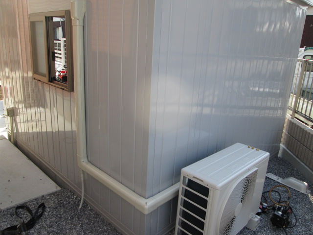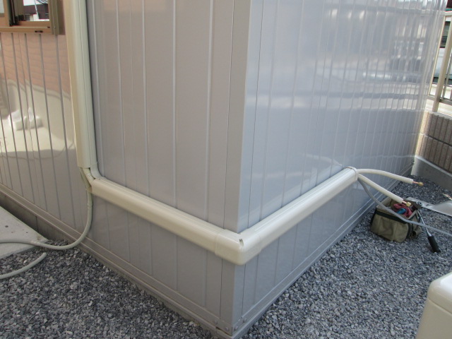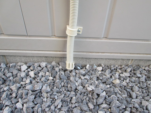 外部はこんな感じで仕上がりです。 ドレンホース(水の出るホース)には、虫さんカバーを取付けます。
