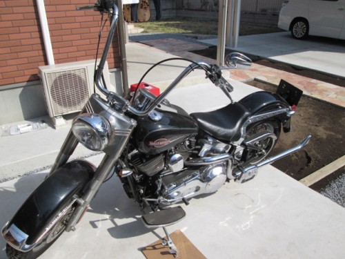 で、このエアコンは誰の為に取り付けたかと言いますと、、、。 このハーレー君の為のエアコンでした!!! 大切にされてますねェ、、、。