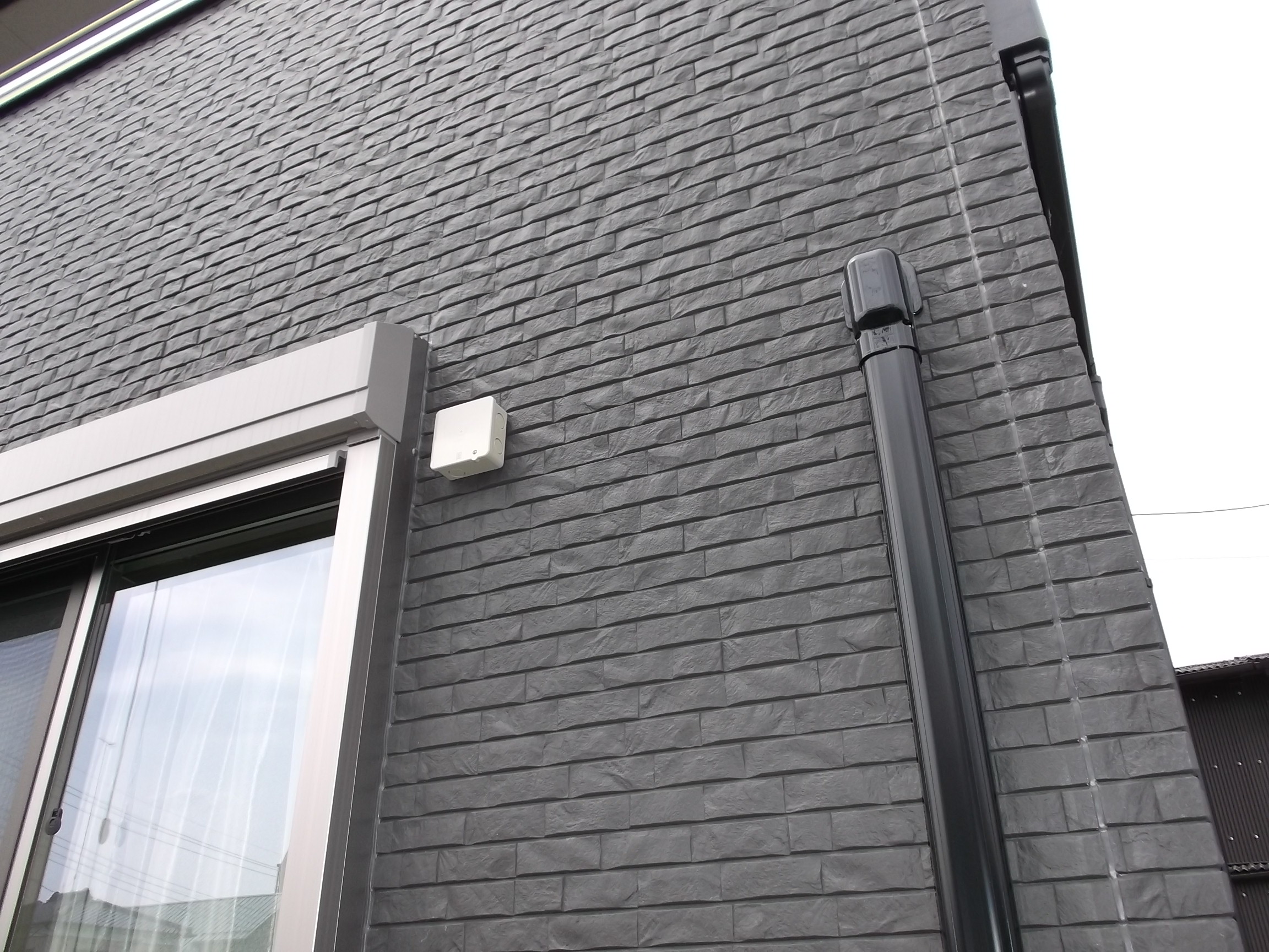 ご新築のエアコン工事の時に、センサーライトを付けたいとの事でした。 電源が付近には無く、エアコンコンセントより真後ろにボックスを付けて電源を確保しました。ボックスの右側にセンサーライトを取付けします。