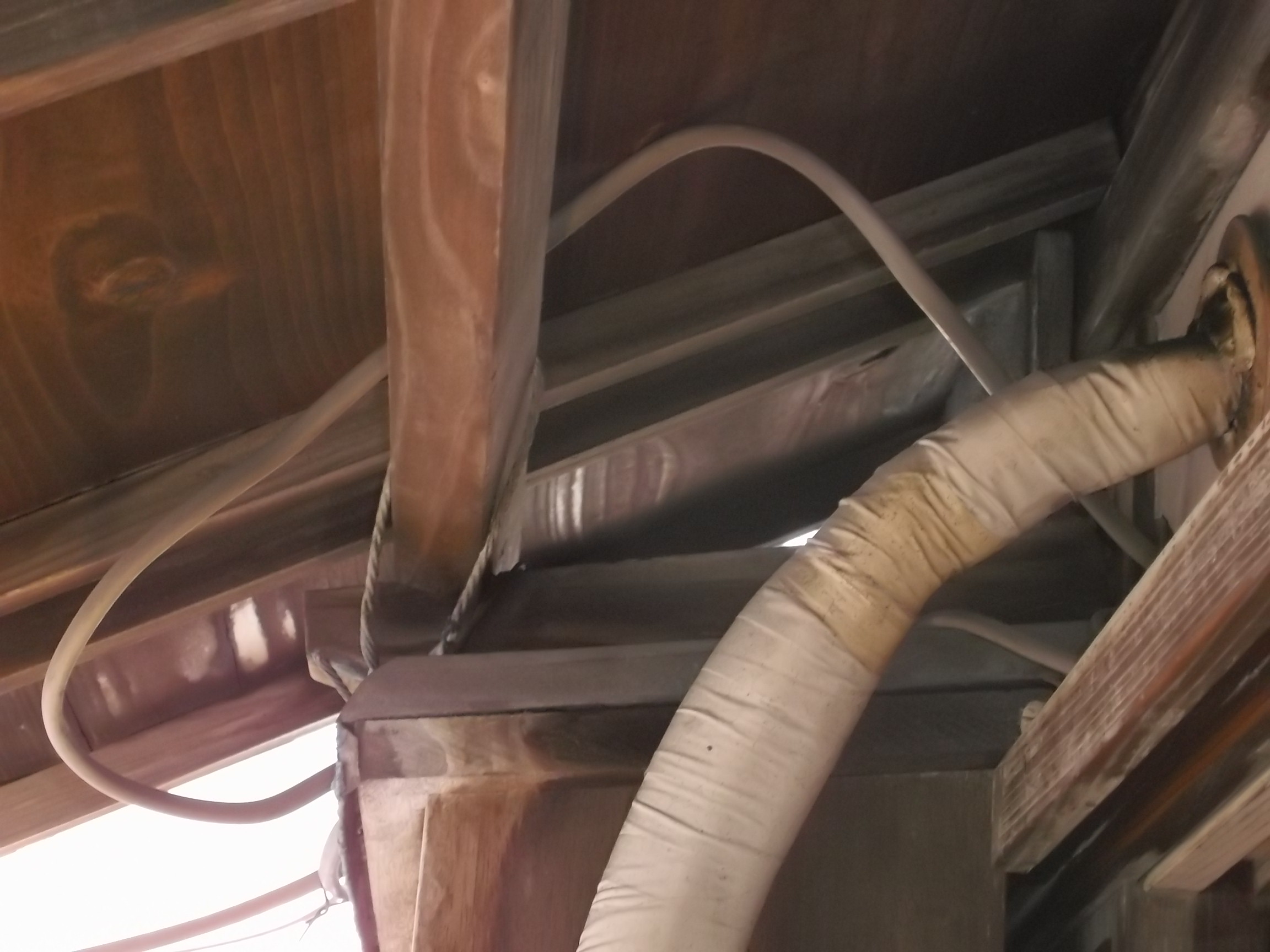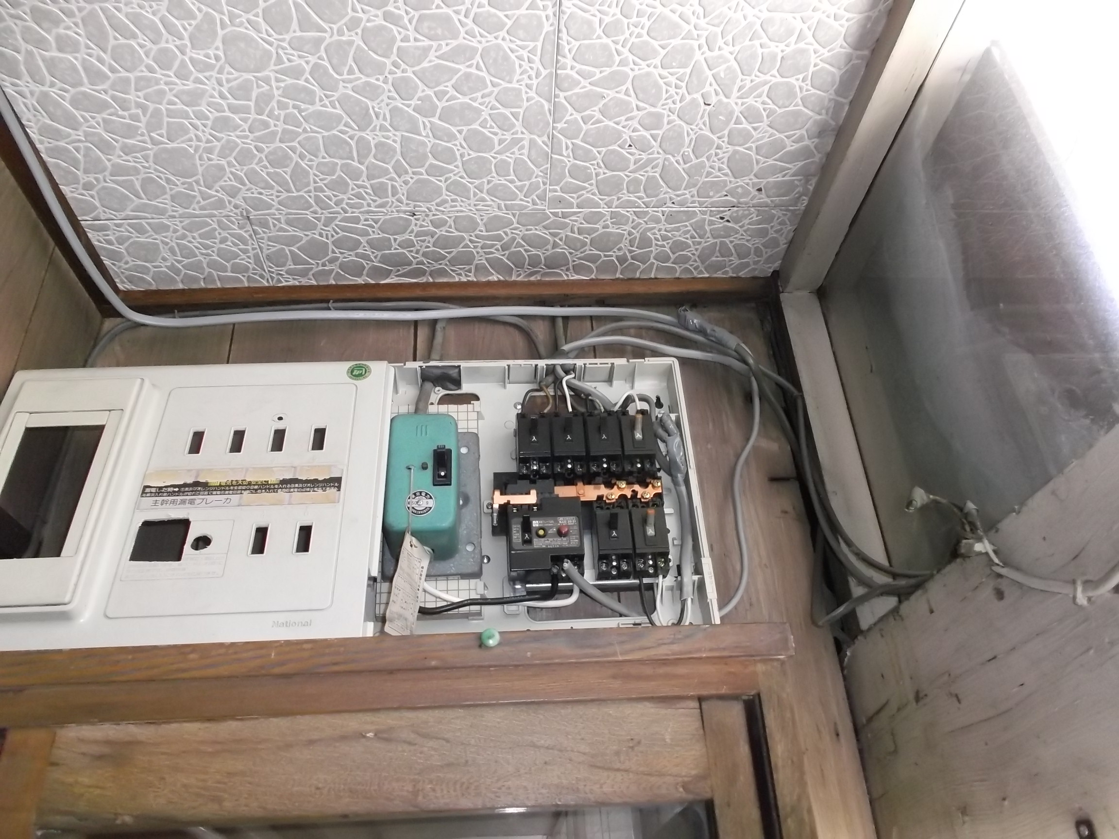 電線の整理です。 いろいろな所から電線が伸びてきてます。 ゴチャゴチャしている電線を調査しながら、配線を改修してきました。 漏電した配線も改修して、取り合えず安心してもらいました。 増改築を繰り返して、築後数十年の建物です、、、。
