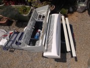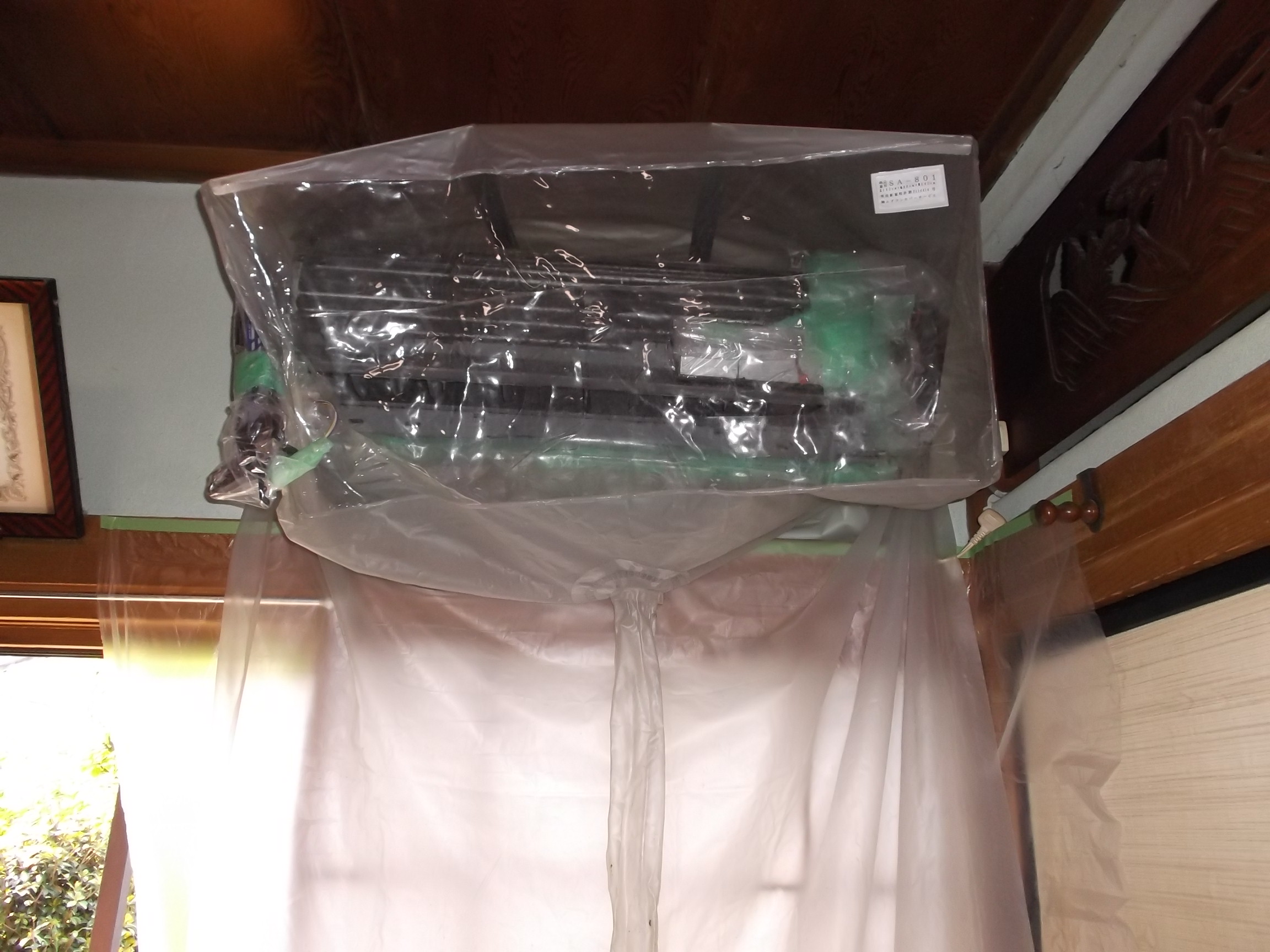 全面パネル・ルーバー・フィルターなど、外せる物は皆取り外します。 電気部品が在る部分は念入りにビニールやテープで養生をします。 室内機は専用のカバーで覆い、洗浄液や洗浄水が飛び散らないように注意しての養生です。 その他、壁や床にも水や洗浄液が飛び散ってもいいように、ビニール等々を張り付け・敷き詰めしてからの作業となります。部品外しと養生作業で、30分~40分私は掛かります、、、。 ここまでしてから、ようやくクリーニング作業を始める事が出来ます、、、。