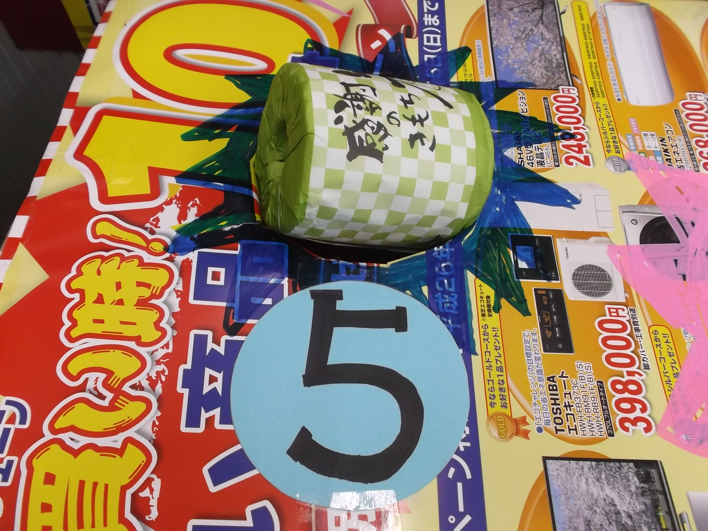 5回チャレンジして、5に入れば5個で10に入れば10個をお持ち帰りデス。 最大50個のお持ち帰りデス。 1度も成功出来ないときは、、、5個、、、のみ、、。 と、その場の店主の気持ちで「 個」をお持ち帰り頂きます!!!