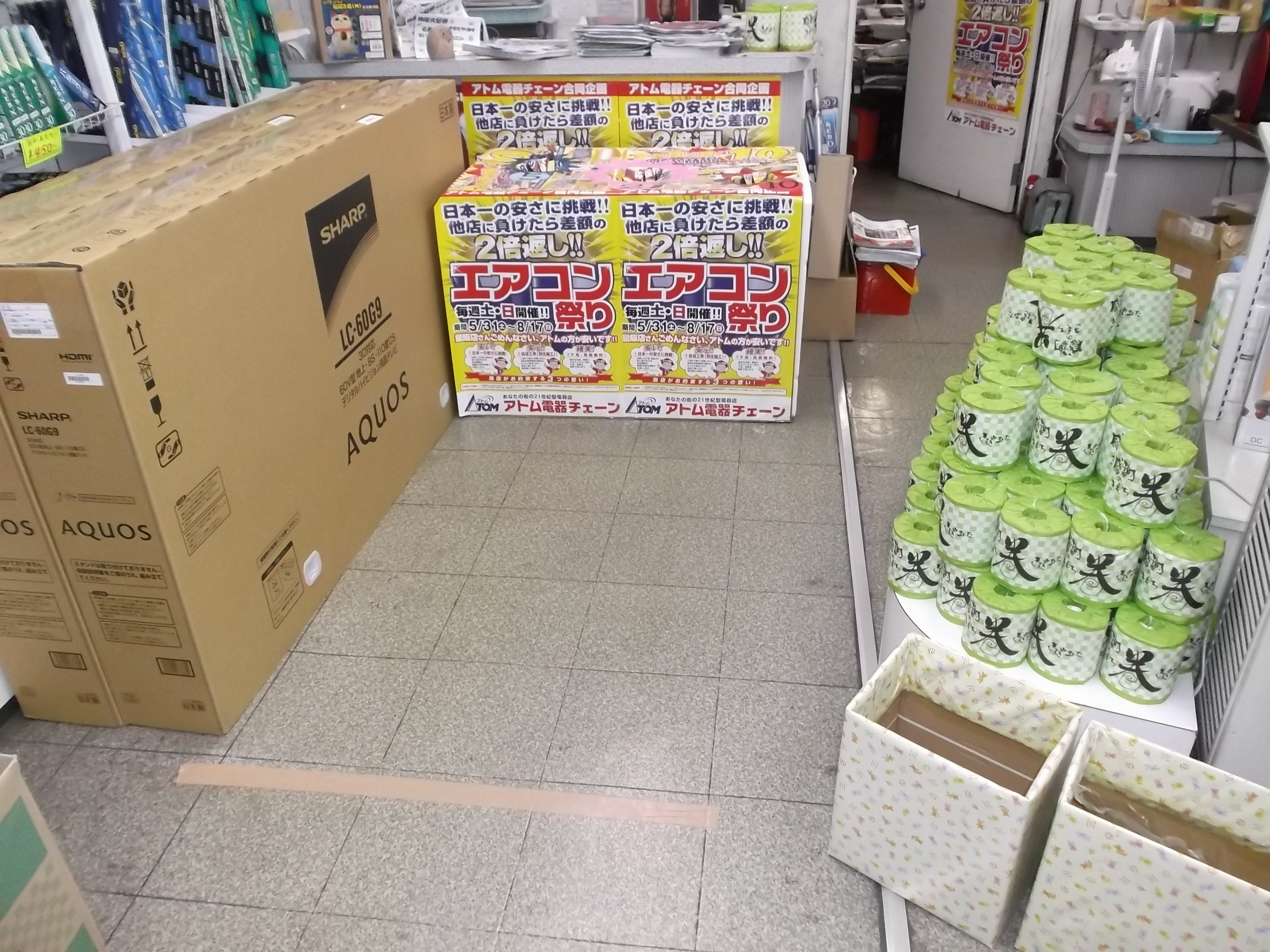 多くのお客様方においでいただきまして、誠にありがとうございます!!! ビッチリ積み上げた感謝の気持ちの「トイレットペパー」の山も随分低くなり、家内の提案で用意した「カラフルパラソル」は全部出払いまして、大盛況でお開きとなりました。 ご来店が出来ないお客様からの商品ご注文と、「カラフルパラソルとトイレットペパーを、、、お願い取っといて。」のありがたいお電話も、感謝感謝致します!!! 『開催して、良かった。』が、正直な気持ちです。 アトム本部主催の様なイベントと違い、開催準備は基本自店で全て段取り、、、。 天候にも恵まれまして、一安心です。 何と言っても、「アトム電器 豊岡南店」さんの個展の準備・段取りを見ていたら、『俺もやらな、、、』と思いスタートしたのが始まりです!!! 『アトム電器 豊岡南店』のご家族のチームプレイに、感謝しつつ、元気付けられました。 見習える事はすぐ見習い、真似できる事はすぐ真似しますので、ご指導ください!!!