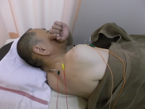 昨年の1月~2月に手術・入院して調子良くなった私の「右肩鍵盤」ですが、最近痛いです。 で。 地元の「オレンジ整骨院」(栃木女子高北側付近)にての治療風景・・・・電気治療の後、針治療をしている最中です。針を6本打ってから、その針の肩と腕に電気を流してピクピクしてます。 ポーズが「おかまちゃん」風ですが、真剣に治療中。