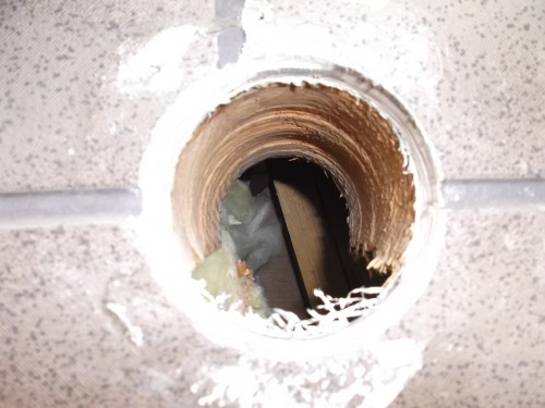 奥に斜めに見えるのは「筋交い」です。筋交い左側に室内側の配管穴があいてます。 手前の木材ですが「梁」(はり)です。この壁面が出窓になっています。出窓を支える「小梁」でしょう、、、。 外部から開けたと思われます。 真っ直ぐにホルソー(穴開けの工具)の跡が残っています。 写真を撮り、お客様に現状を確認して頂き、協力業者さんの大工さんにも連絡・確認して工事を進める事になりました、、、。 外壁が白く見えるのは、粉じんで無く「キズ」でした。開口時に工具を暴れさせたのでしょう、、。センタードリル無しで、いきなり開口作業でもしたのやら、、、。