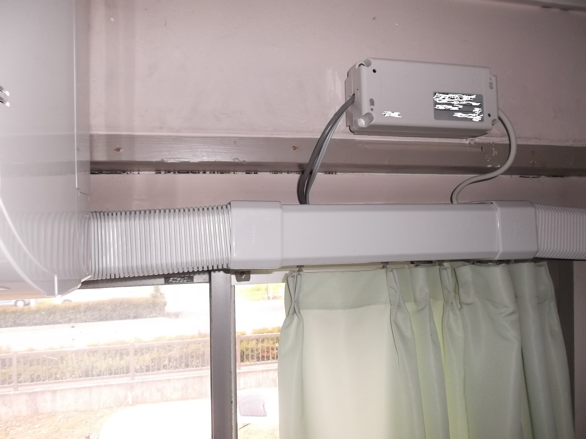 左がエアコンの室内機です。 室内用の配管カバーが横引きされて撮り付けていますが、左右のジャバラのカバーが下に下がっています。 傾斜がゆる過ぎてドレン排水が完全に流れないで「溜まり水」になり、クレームの「カビ臭い」の原因がこれでした。 私、取り付けていません、、。 「調べて欲しいい」と言われましたので、、、。 横引きが1メーター以上在り、傾斜が取れなければ、こんな事にもなります。