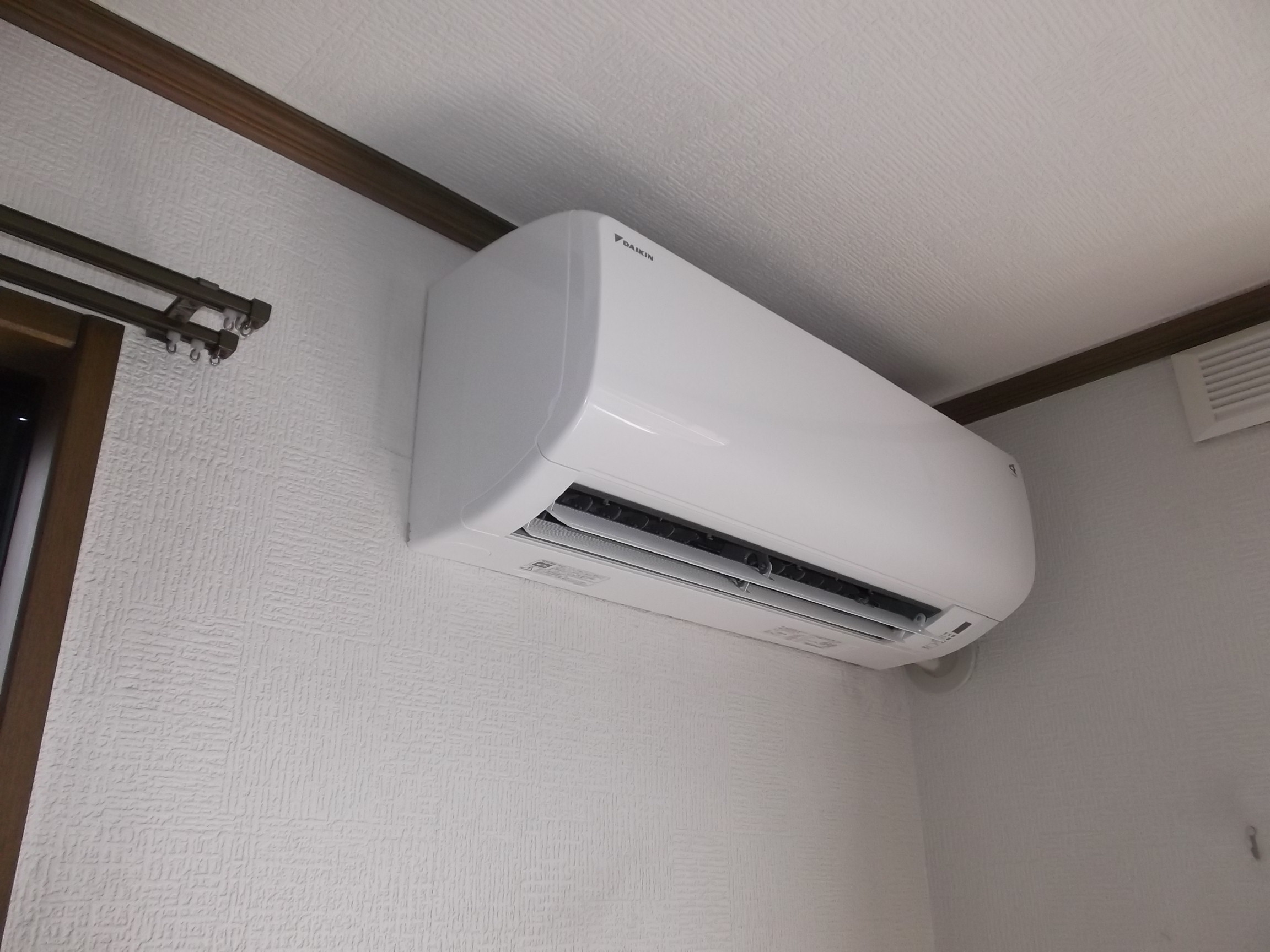 ダイキンのエアコンに交換してきました。 配管は向かって右側に出し、2階ベランダに室外機を設置しました。