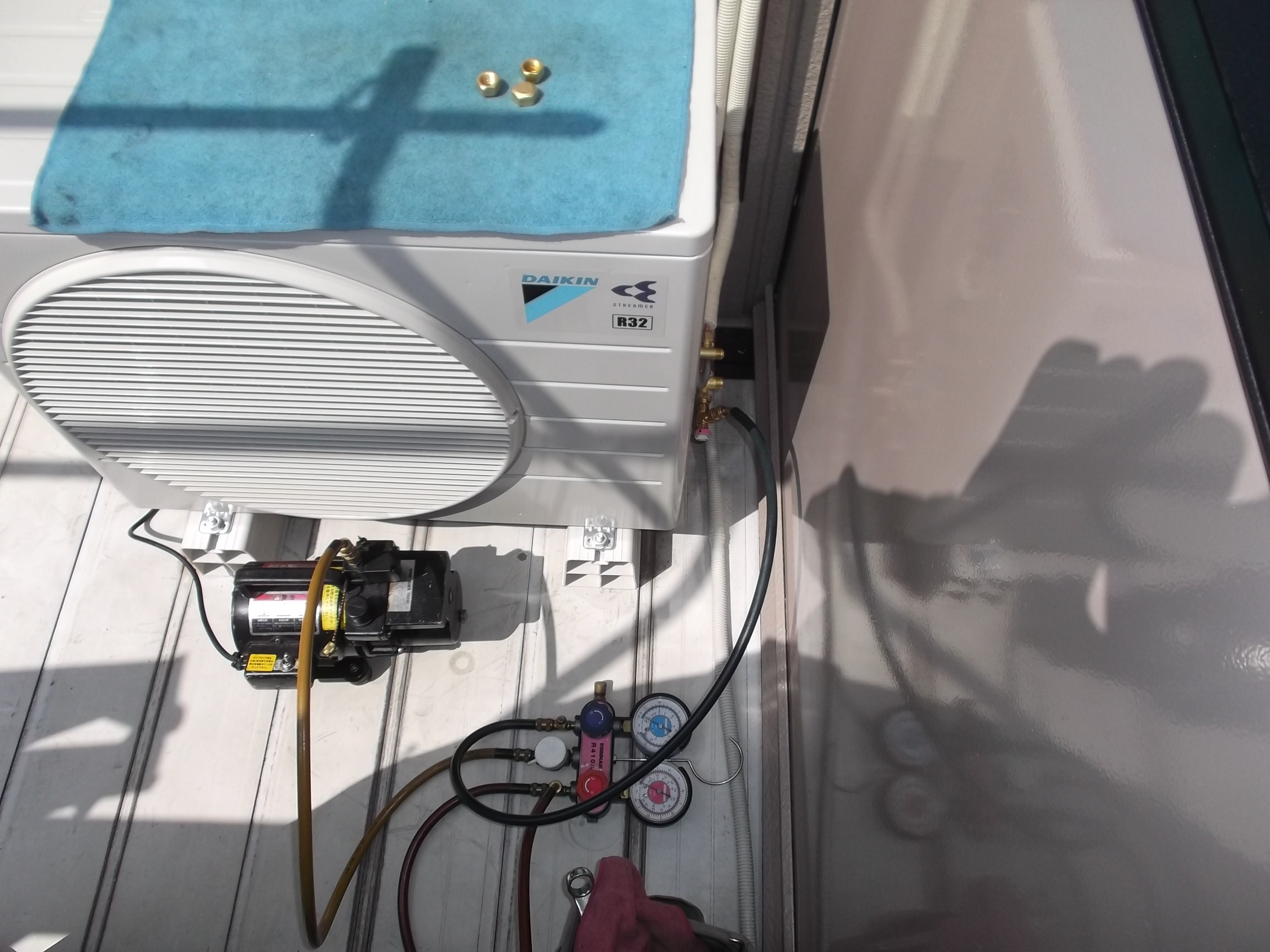 なるべく右壁側に設置して欲しいとの事で、真空引き作業等を終了後に室外機を右に寄せてから、配管カバーをかぶせます。 すぐご近所に大型量販店さんが在りますが、そちらで商品・型番・価格等々を確認してから当店にご依頼頂きました、、。 価格対応も量販店より安い対応が出来まして、私も一安心、、、。 工事後即金でお支払いいただきまして、また一安心、、、。 当店、地方の小さな「街電」です。そんなに、バンバンエアコンが売れる訳ではありませんが、一つ一つ丁寧に取り付けしていきます、、、。 一日に4台・5台と、取り付ける能力だけは在りません。
