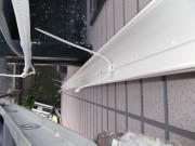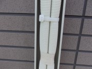 スタッフブログ 2014年7月19日2階のお部屋から、真っ直ぐに配管カバーを真下に卸しています。 カバーの中には「銅配管・電線・ドレン管」が入っていますが、それなりの重さが在ります。 数年の内にその重さの影響が出て来ます、、、。 常に配管類の自重で、下方向に引っ張られている訳です、、、。 配管・配線・ドレン管はテープ巻きでカバー内に納めていますが、それを「保持」してくれる部材が必要です。 特に、写真の様に2階から1階まで「直下」の時には、、、。