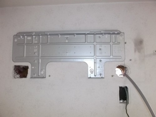 左の穴が埋設配管が通っていた配管部分です。 埋設配管とは、、、。新築時に銅配管・渡り電線配線・ドレン排水配管を壁の中に埋め込んで置く工事方法デス。 左側の穴から配管・配線・ドレンが出ていました、、。 取り付け板の中央付近で、室内機の配管とジョイントします、、、。 が。 室内機を取り外す途中で右側にも同じ穴が開いているのを発見!!! お客様に説明して、右側配管に変更しました。(右の方がとてもやりやすいのです、、、) 外壁側からホルソーと言われる工具で穴を開けて電線を通した写真です。